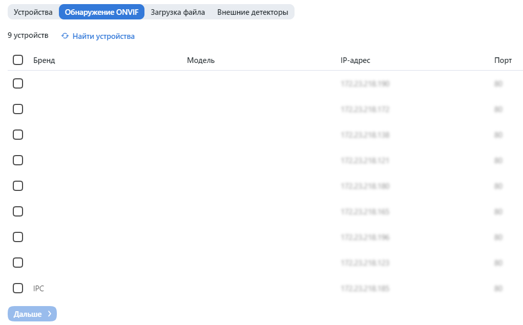 Если вы используете камеру ONVIF, выберите ее из списка обнаруженных устройств для автоматической загрузки доступных настроек и видеопотоков.
