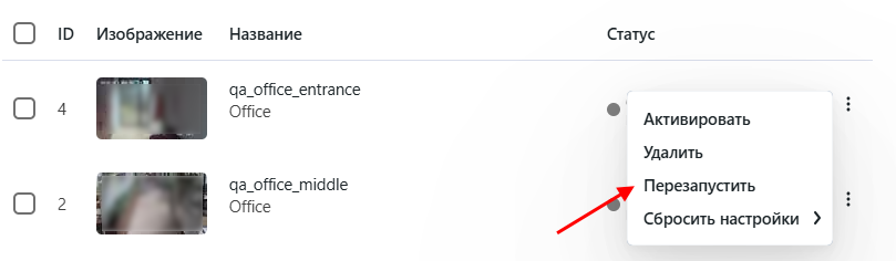 Для перезапуска job-задания откройте настройки камеры и нажмите на кнопку Перезапустить. При этом количество ошибок будет обнулено.
