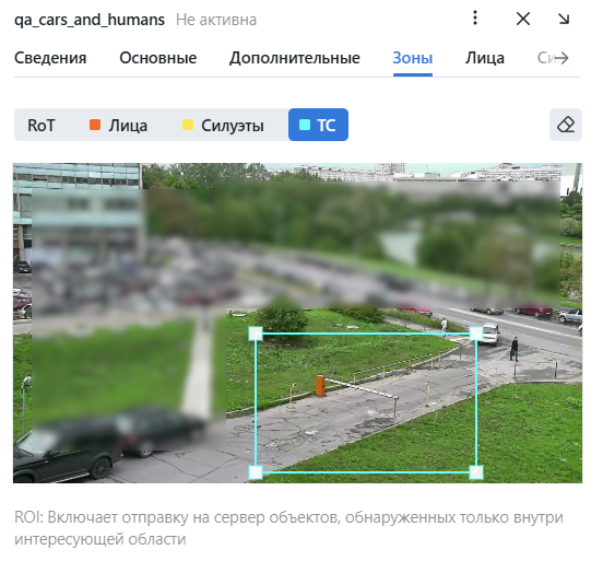 На вкладке Зоны укажите область отслеживания RoT в поле зрения камеры и область интереса (ROI) для активированных детекторов, если это необходимо. Чтобы отменить выбор области, нажмите