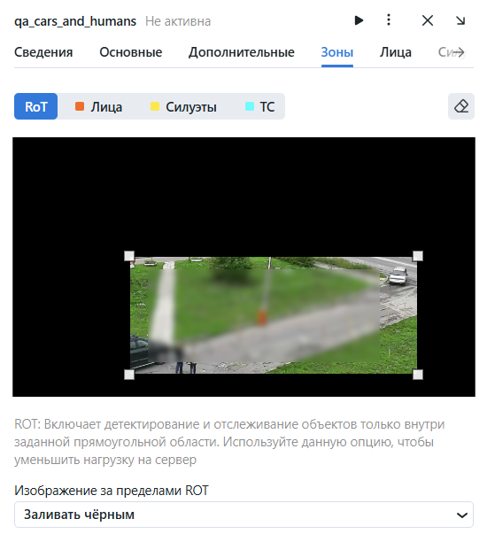 Заливать чёрным: полные кадры отправляются с заполненной черным цветом областью за пределами ROT.Не изменять: полные кадры отправляются незаполненными; область за пределами ROT заполняется только перед детектированием объектов.