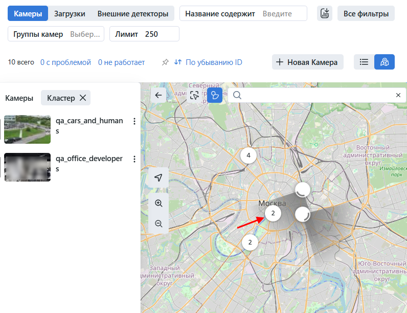 для перехода в режим отображения карт. Камеры при отдалении группируются в кластеры, а при приближении кластер разбивается на отдельные объекты.