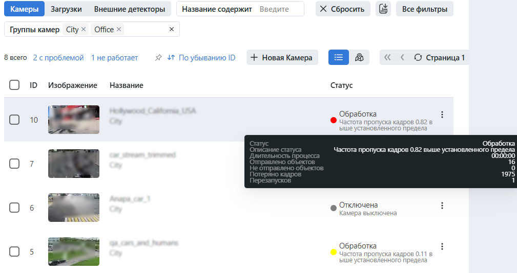 Камеры в списке можно отсортировать по ID в порядке возрастания или убывания. Также можно использовать быстрые фильтры для отображения камер, имеющих статус работы со сбоем (Желтый и Красный статусы). При наведении курсора мыши на статус камеры отображается подробная информация об ошибке.
