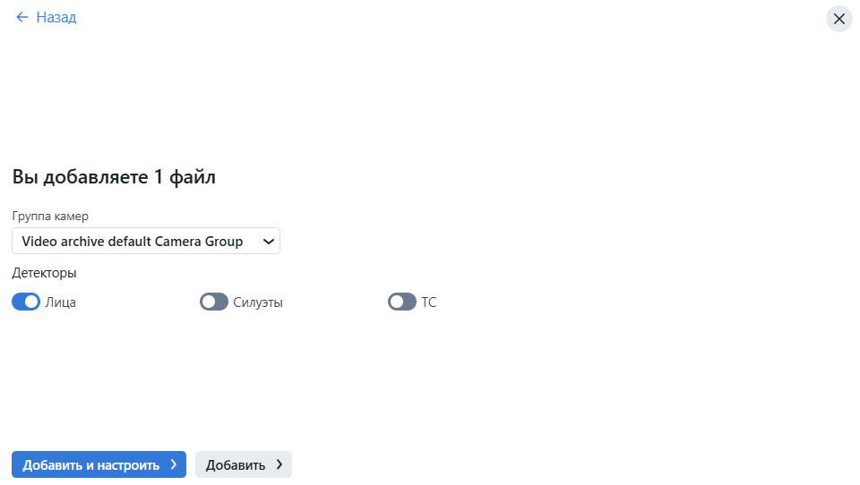 Video archive default Camera Groupидеально подходит для этой задачи. Вы также можете создать новую группу камер с базовыми настройками специально для данного видео. Поставьте флажки для тех детекторов, которые нужно активировать для данного видео: лица, силуэты, транспортные средства.Нажмите на видео в списке, чтобы открыть мастер настройки обработки. Настройте параметры обработки видео аналогичным образом, как и для камер.
