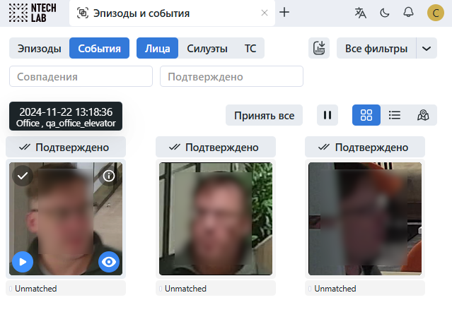 Вы можете работать с лентой эпизодов и событий на видеостене по аналогии с вкладкой Эпизоды и события, включая те же фильтры, которые доступны для эпизодов и событий.