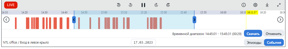 Просмотр записанных с камеры видеофрагментов. Фрагменты будут отмечены на временной шкале фиолетовым цветом. Чтобы быстро переключиться с просмотра архивного видео на прямую трансляцию с камеры, нажмите кнопку Live.
