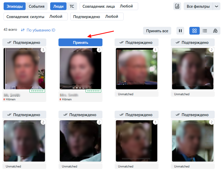 Совпадения: лица: отобразить только эпизоды с совпадением лиц/без совпадения лиц/все эпизоды.