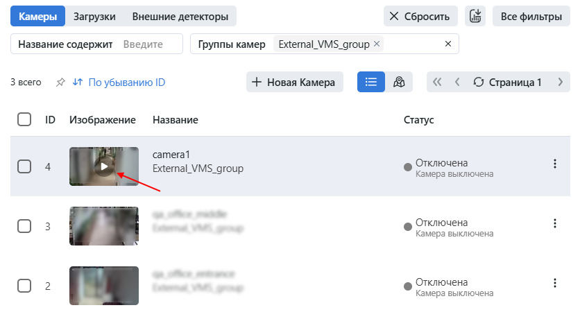 Вы также можете воспроизводить видеоархив через камеру, нажав play на миниатюре камеры в списке камер на вкладке Источники видео. В результате видео с камеры внешних VMS будет отображаться в видеомагнитофоне. Если в указанное время в FindFace Multi имеется записанный видеоархив, то в видеомагнитофоне будет воспроизводиться он, а не видеоархив из внешних VMS.