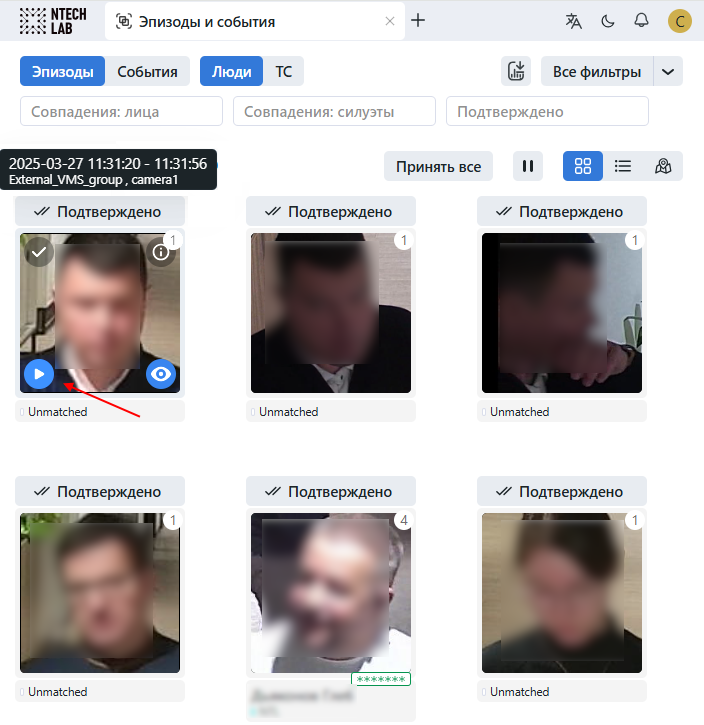 Если Видеомагнитофон развернут и настроен, вы можете воспроизводить видеоархивы из внешних систем управления видео VMS (Axxon, Trassir и Hikcentral) через него. Чтобы использовать эту функциональность, сначала убедитесь, что камера, добавленная из внешних VMS, активна. Затем перейдите на вкладку Эпизоды и события и наведите курсор на интересующее вас событие или эпизод. На миниатюре объекта (лица/силуэта или транспортного средства) отобразится кнопка play. Нажмите на нее, чтобы начать воспроизведение видео с того момента, когда было зафиксировано событие или эпизод с камеры.
