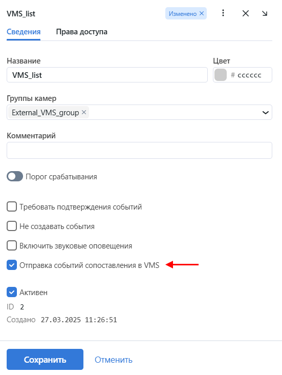 Если вам нужно отправить события на внешнюю VMS, в настройках камеры, добавленной из VMS, проверьте, настроена ли отправка событий на внешние VMS: