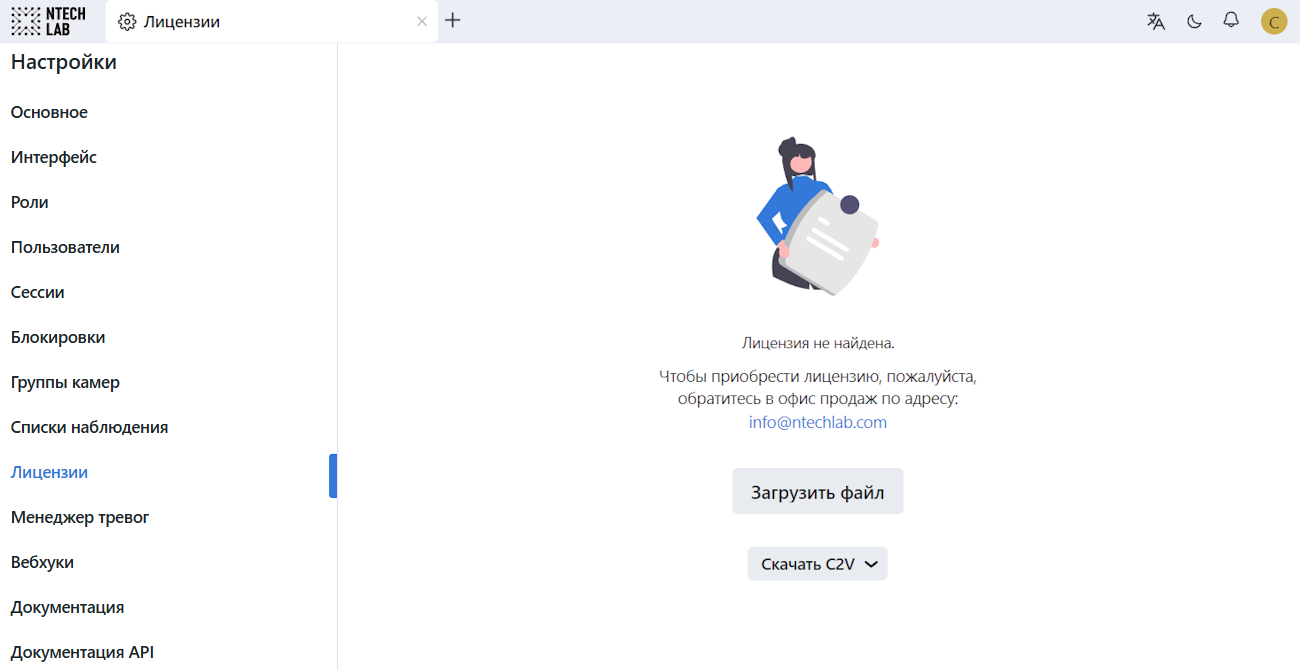 После установки FindFace Multi загрузите в систему файл лицензии, полученный от вашего менеджера или в службе поддержки (support@ntechlab.com). Для этого перейдите в Настройки → Лицензии.