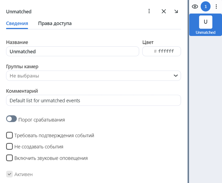 Базовая конфигурация FindFace Multi уже содержит предустановленный список наблюдения, предназначенный для мониторинга событий, для которых отсутствуют совпадения с картотекой. Данный список наблюдения не может быть удален из системы. Для редактирования настроек списка, перейдите на вкладку Настройки. Выберите Списки наблюдения и щелкните Unmatched.