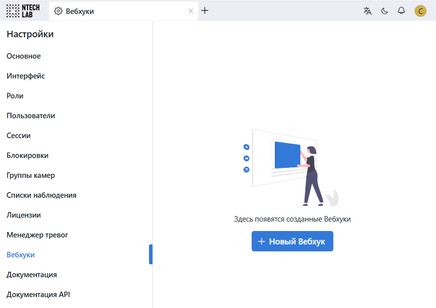 Перейдите на вкладку Настройки. Выберите Вебхуки.