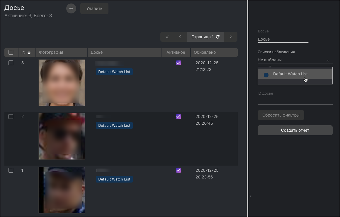 Все созданные в ПК FindFace досье отображаются на вкладке Досье. Используйте фильтр Списки наблюдения, чтобы отфильтровать досье по спискам.