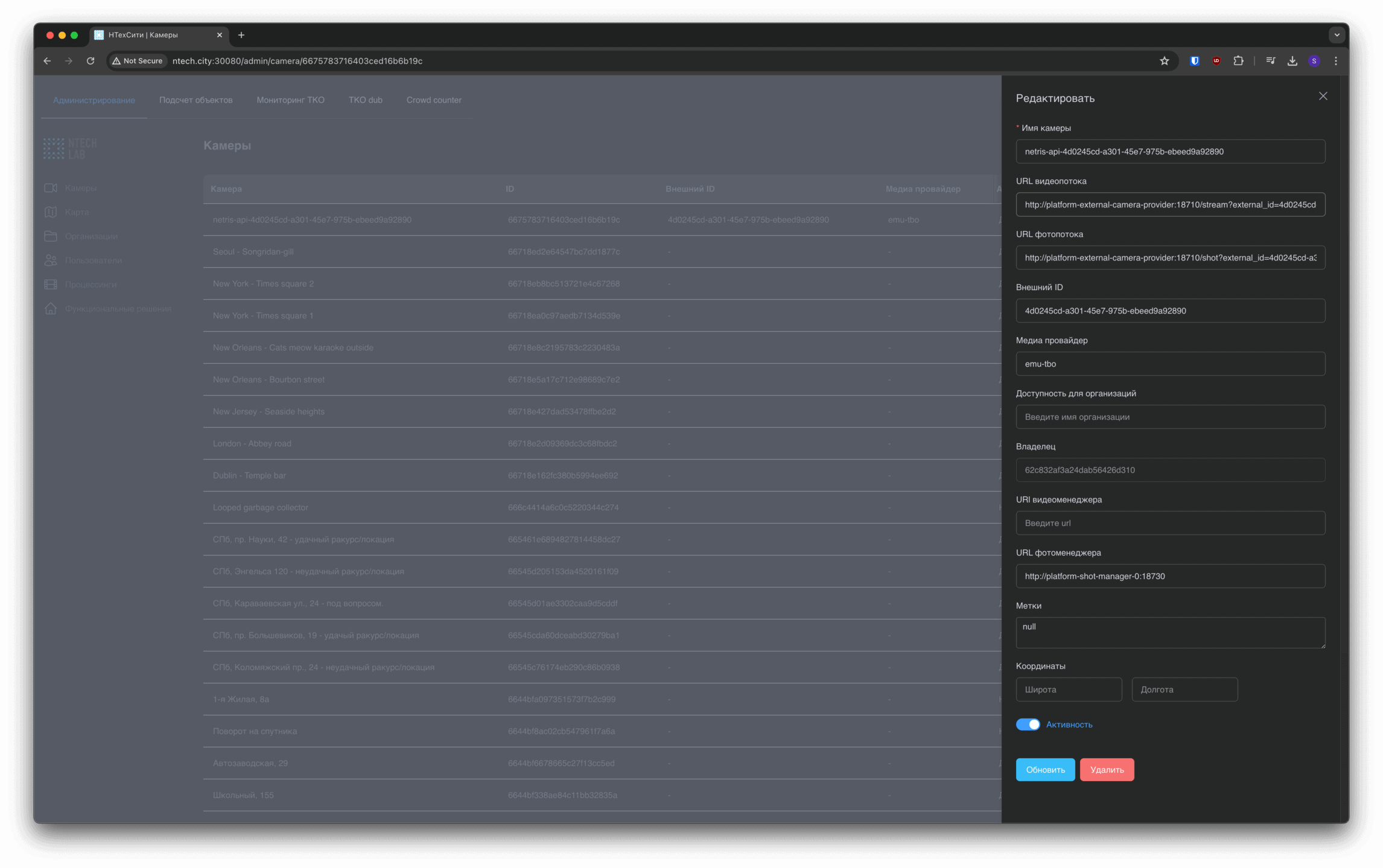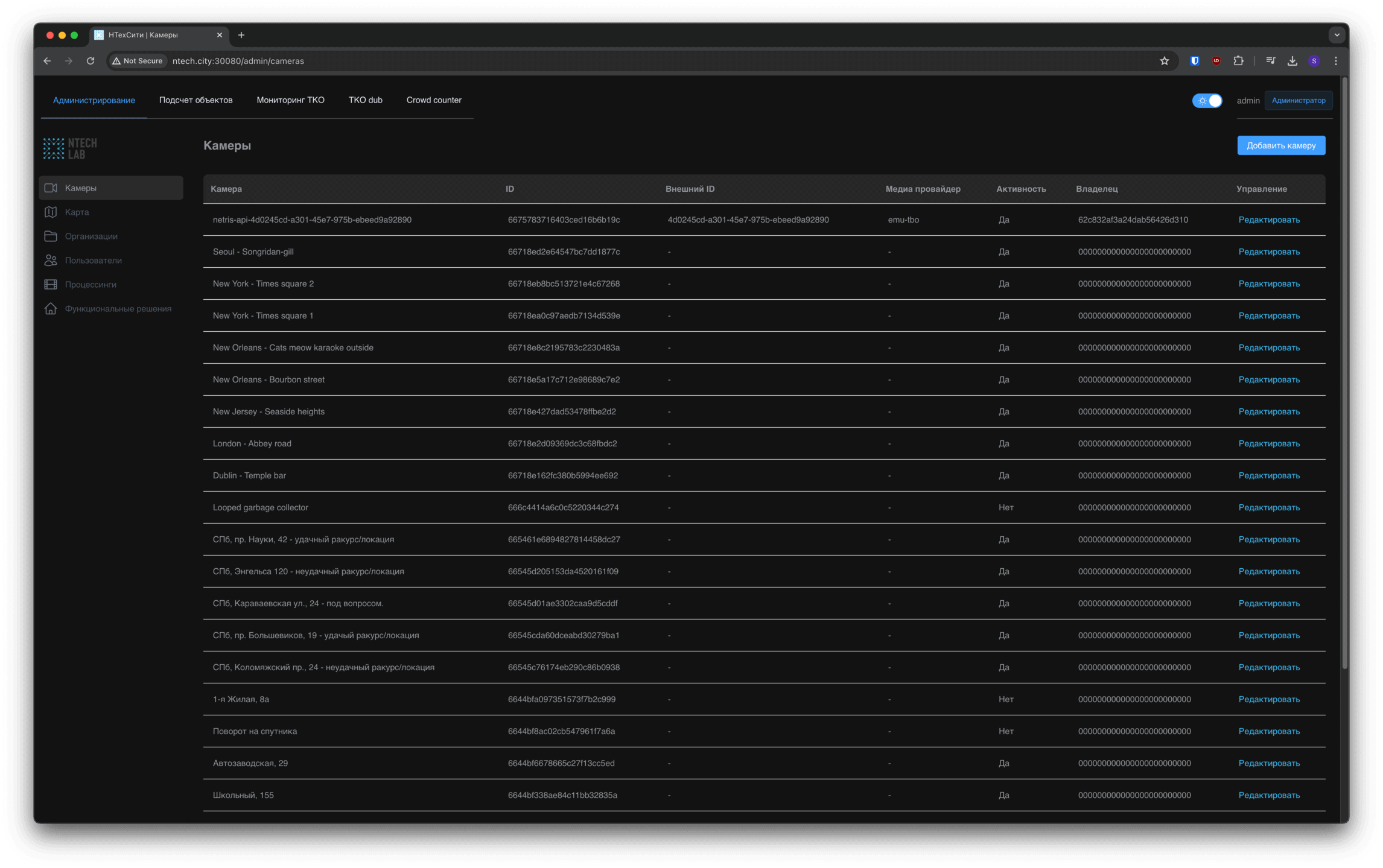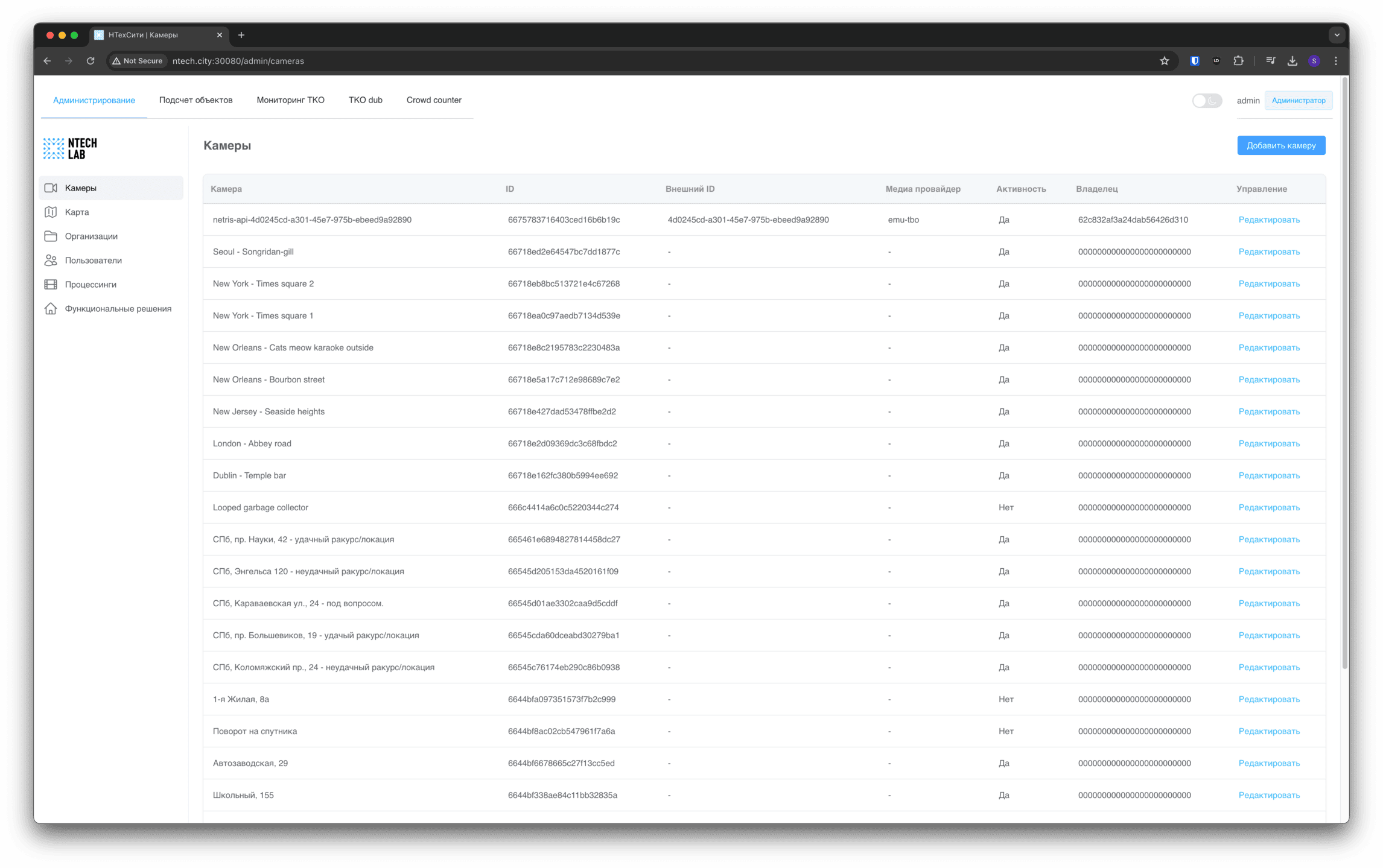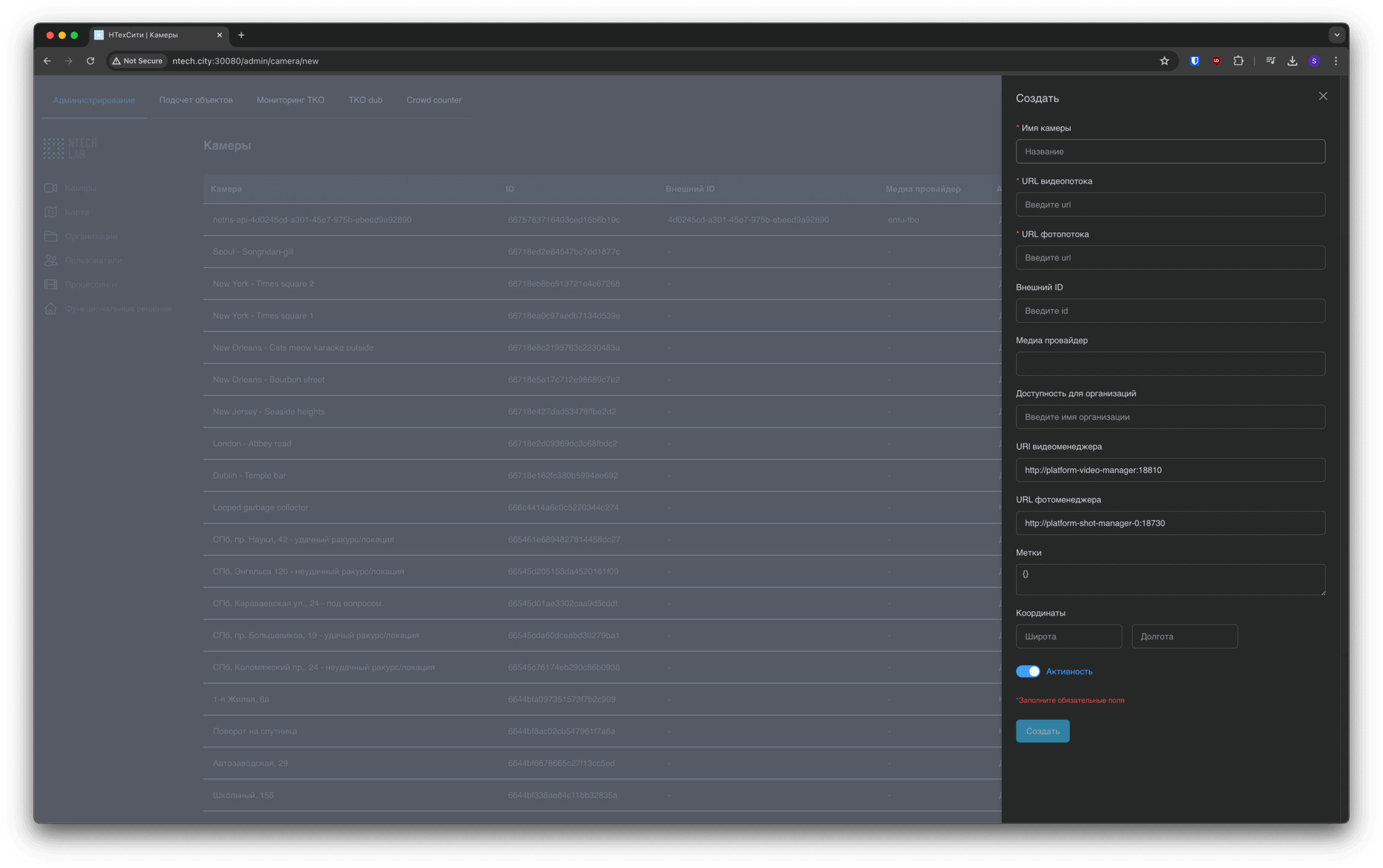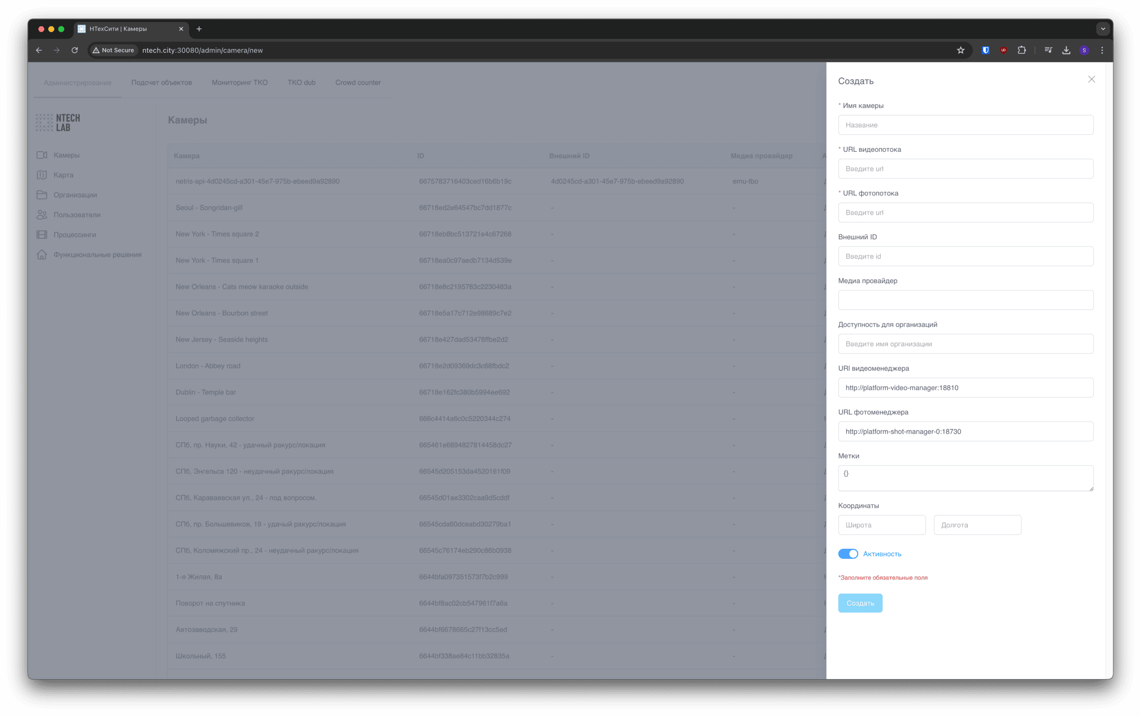 При добавлении камеры используется тот же набор полей, что и при редактировании. Владельцем камеры станет организация, к которой принадлежит пользователь, создавший камеру.