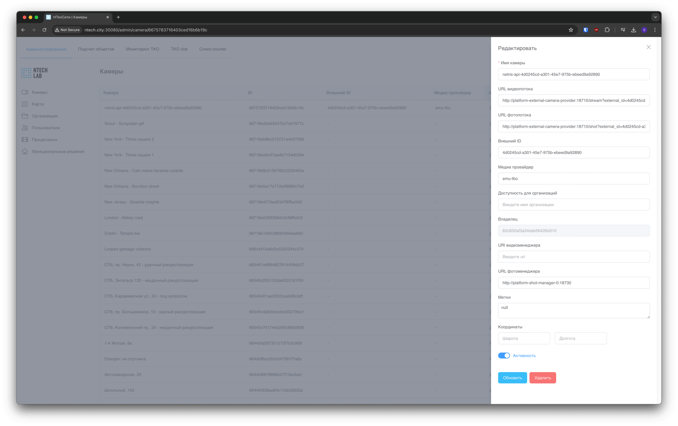 Через меню редактирования организация-владелец камеры может ее удалить.