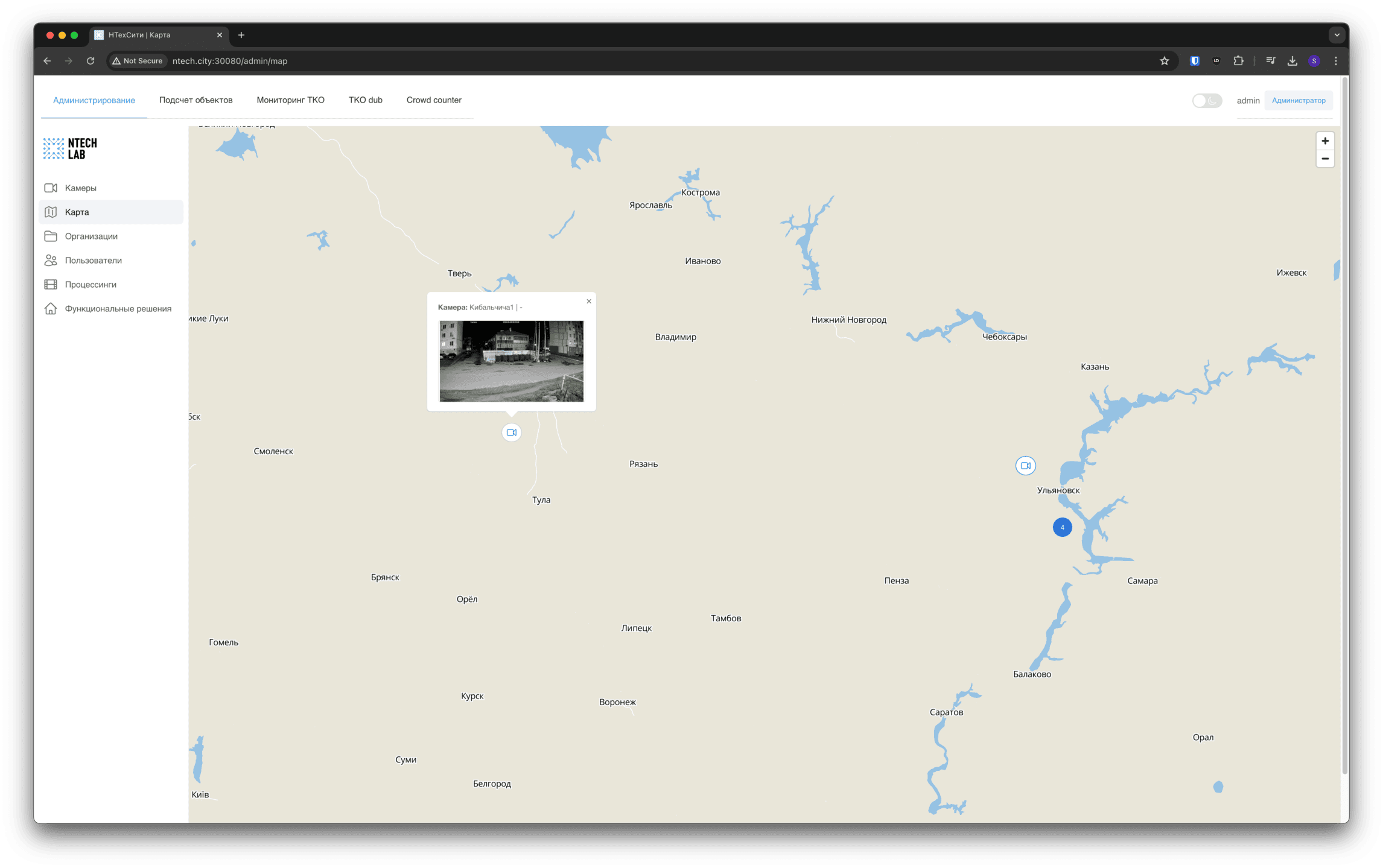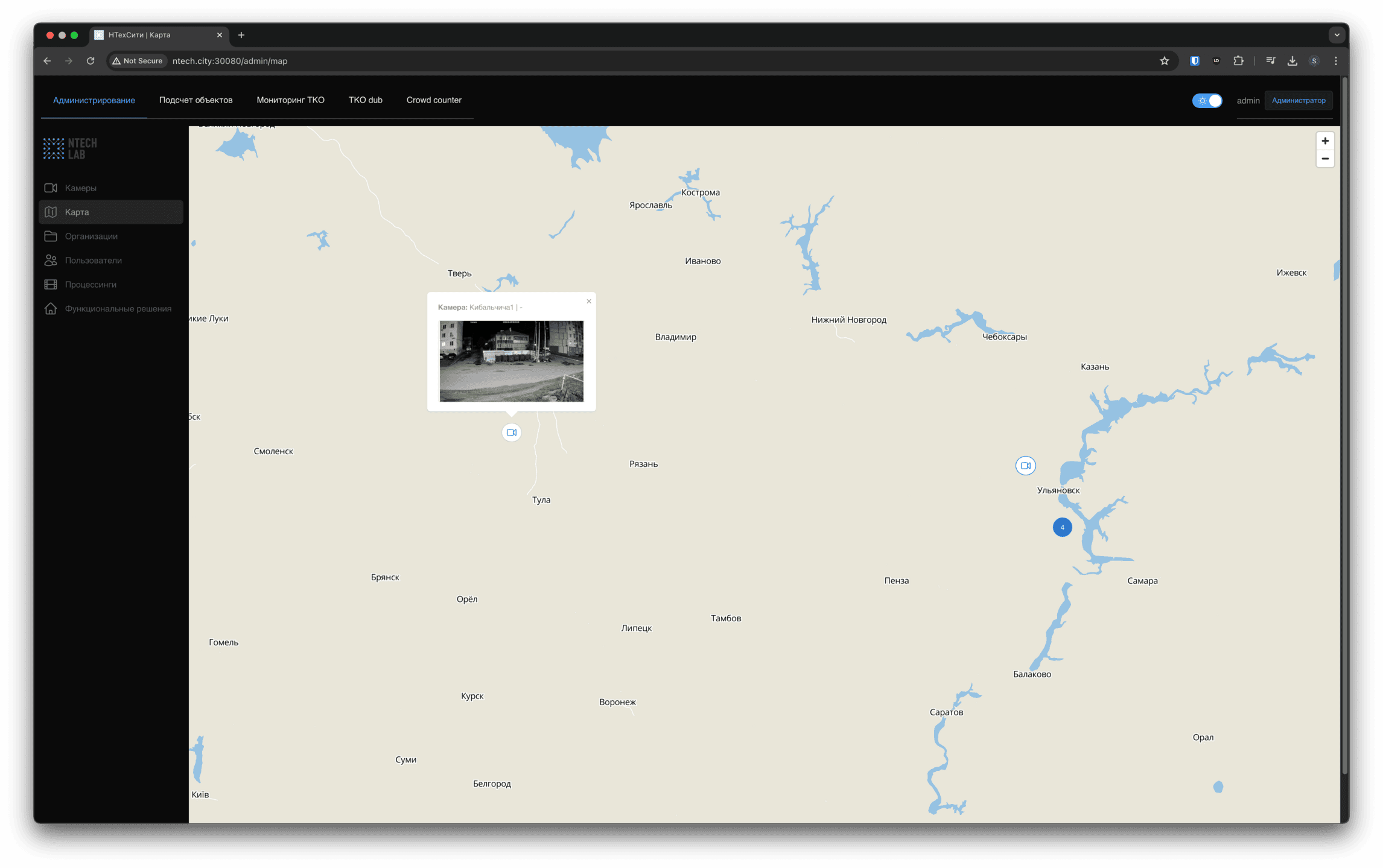 Камеры, для которых заданы координаты, отображаются на интерактивной карте. При нажатии на иконку камеры отображается скриншот с этой камеры.