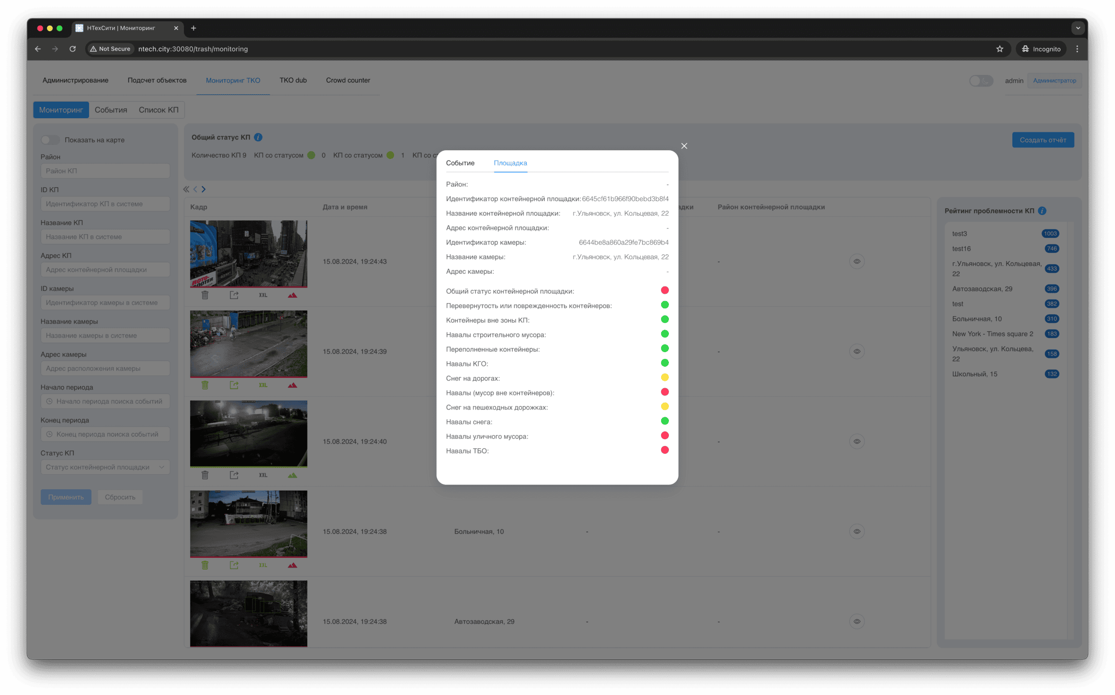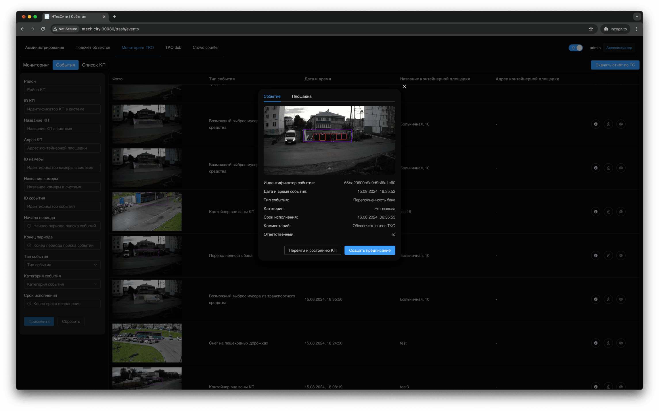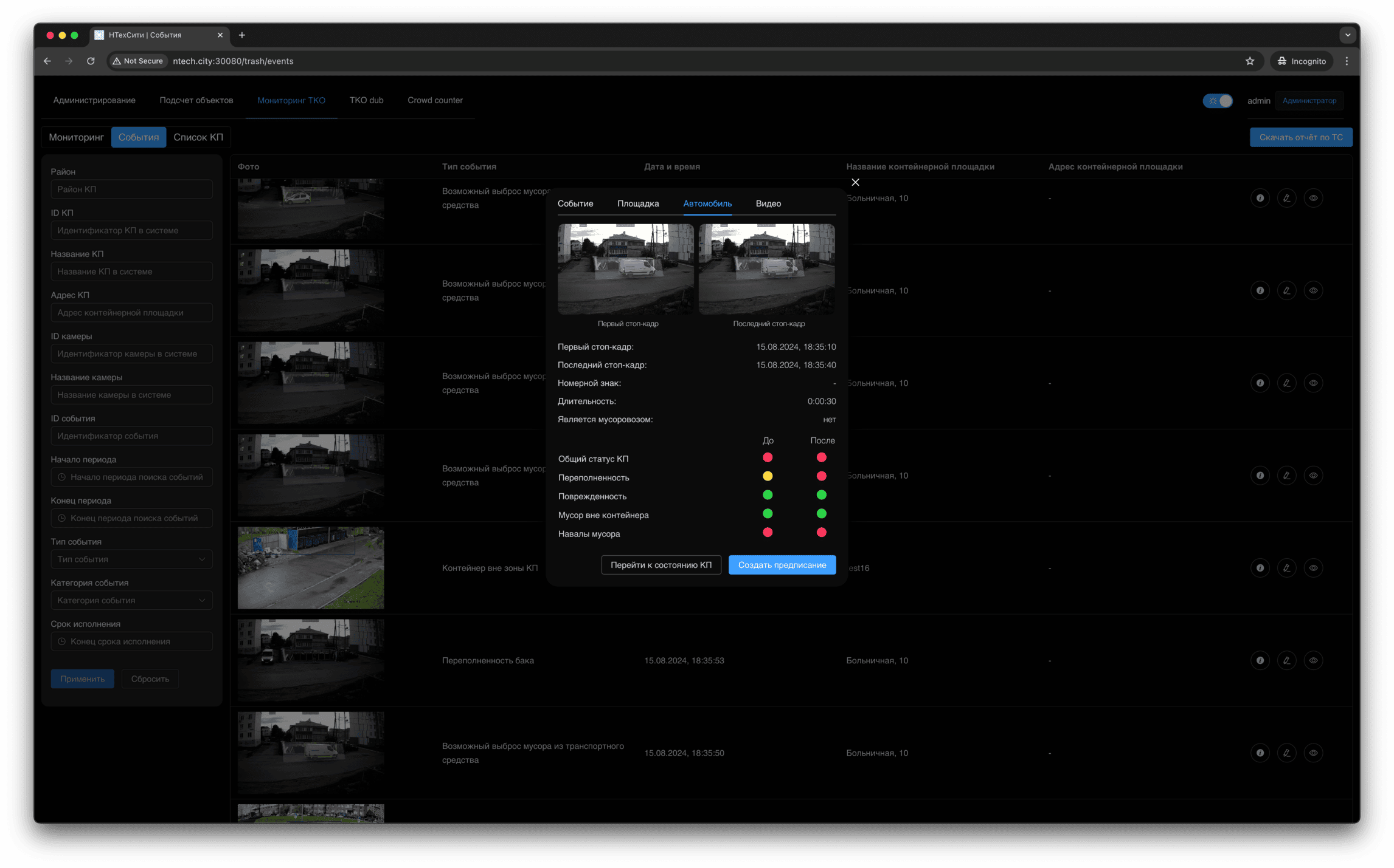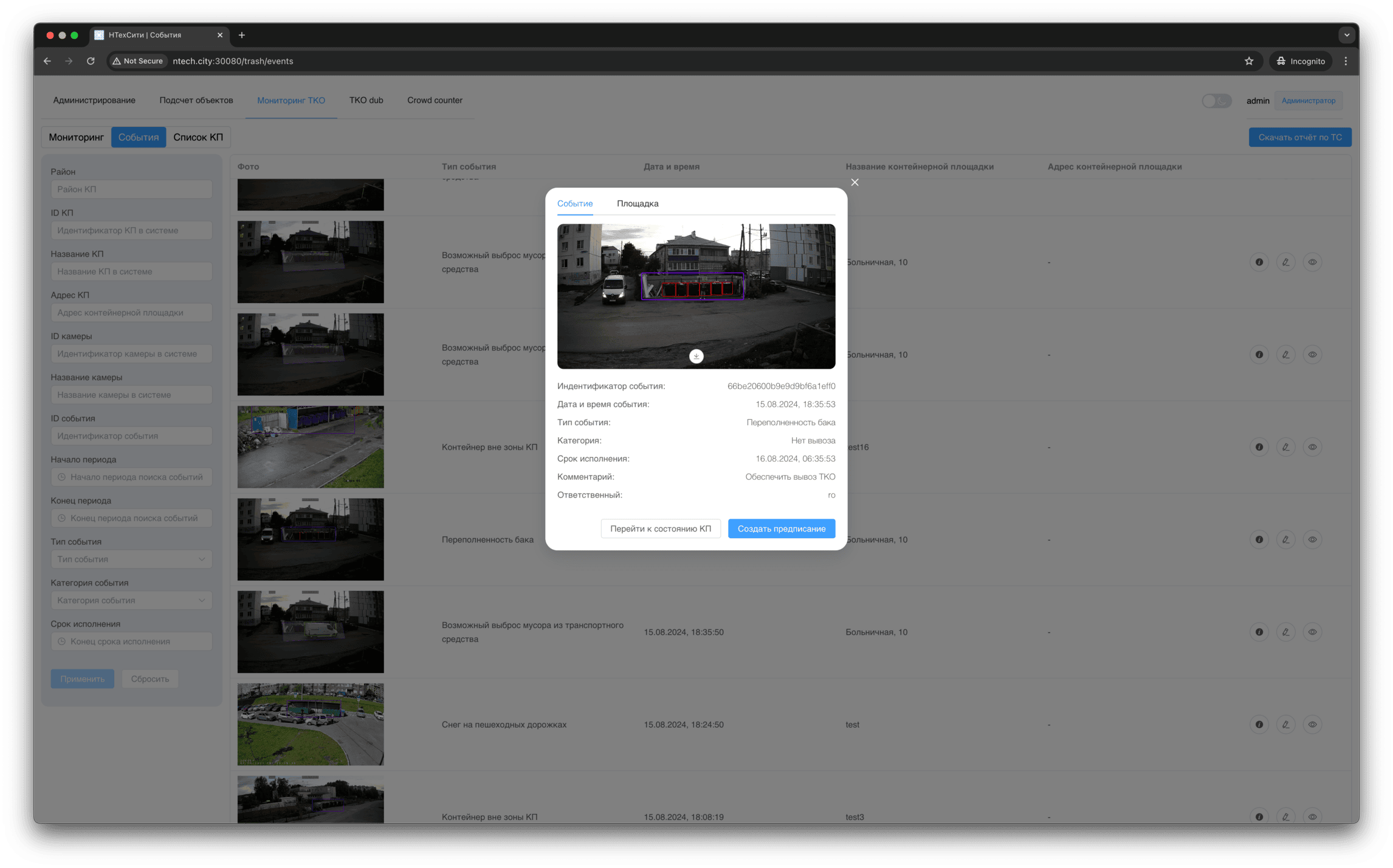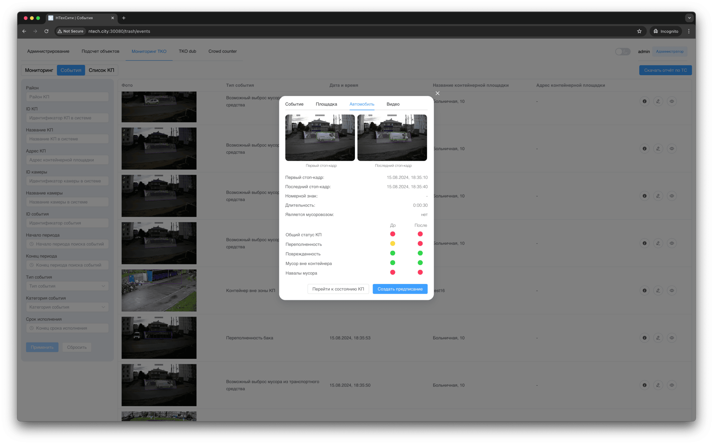 Для события мониторинга доступно детальное представление, в котором отображаются, в том числе, подстатусы контейнерной площадки, определенные на основании результатов работы нейронных сетей и эвристических алгоритмов.