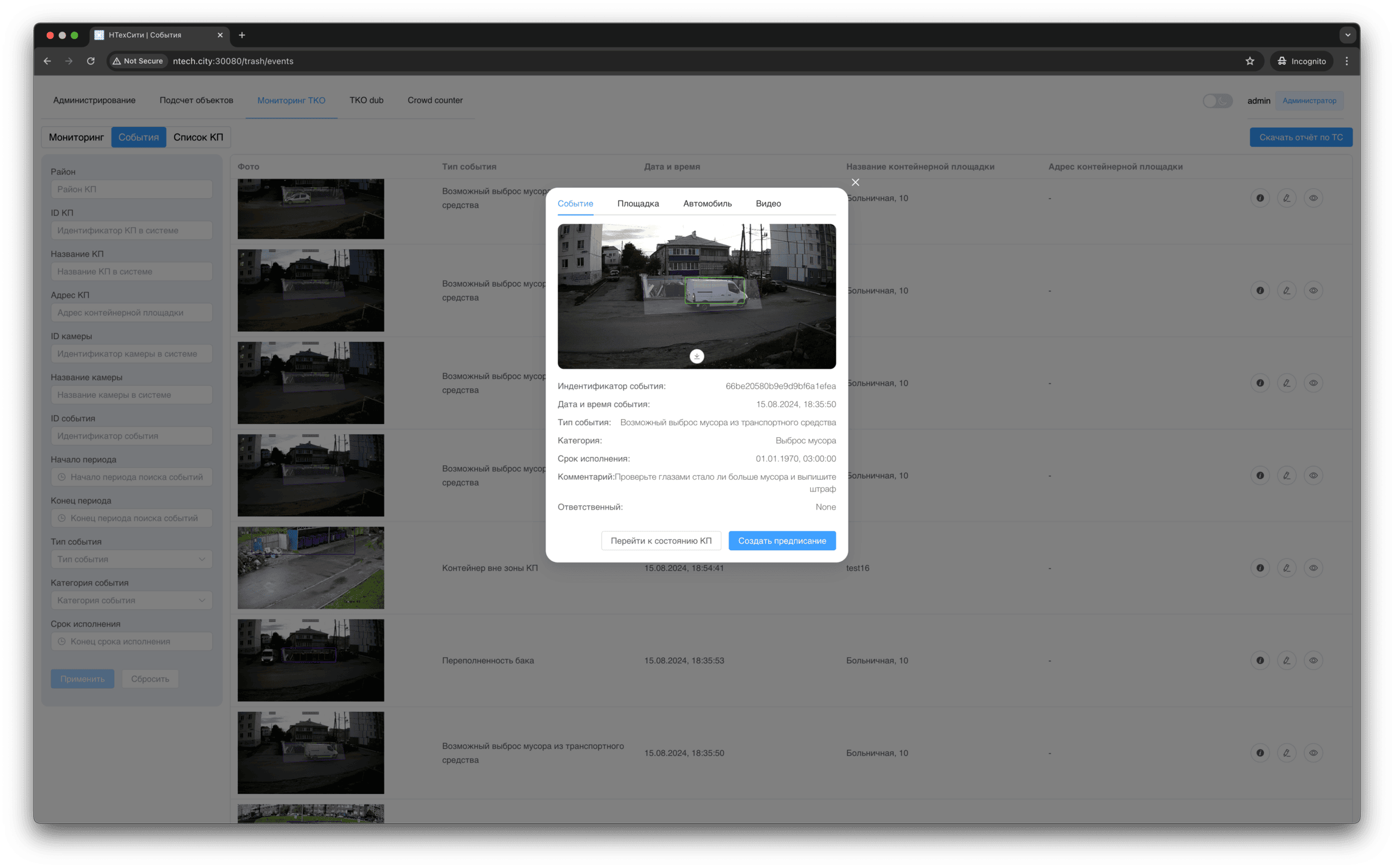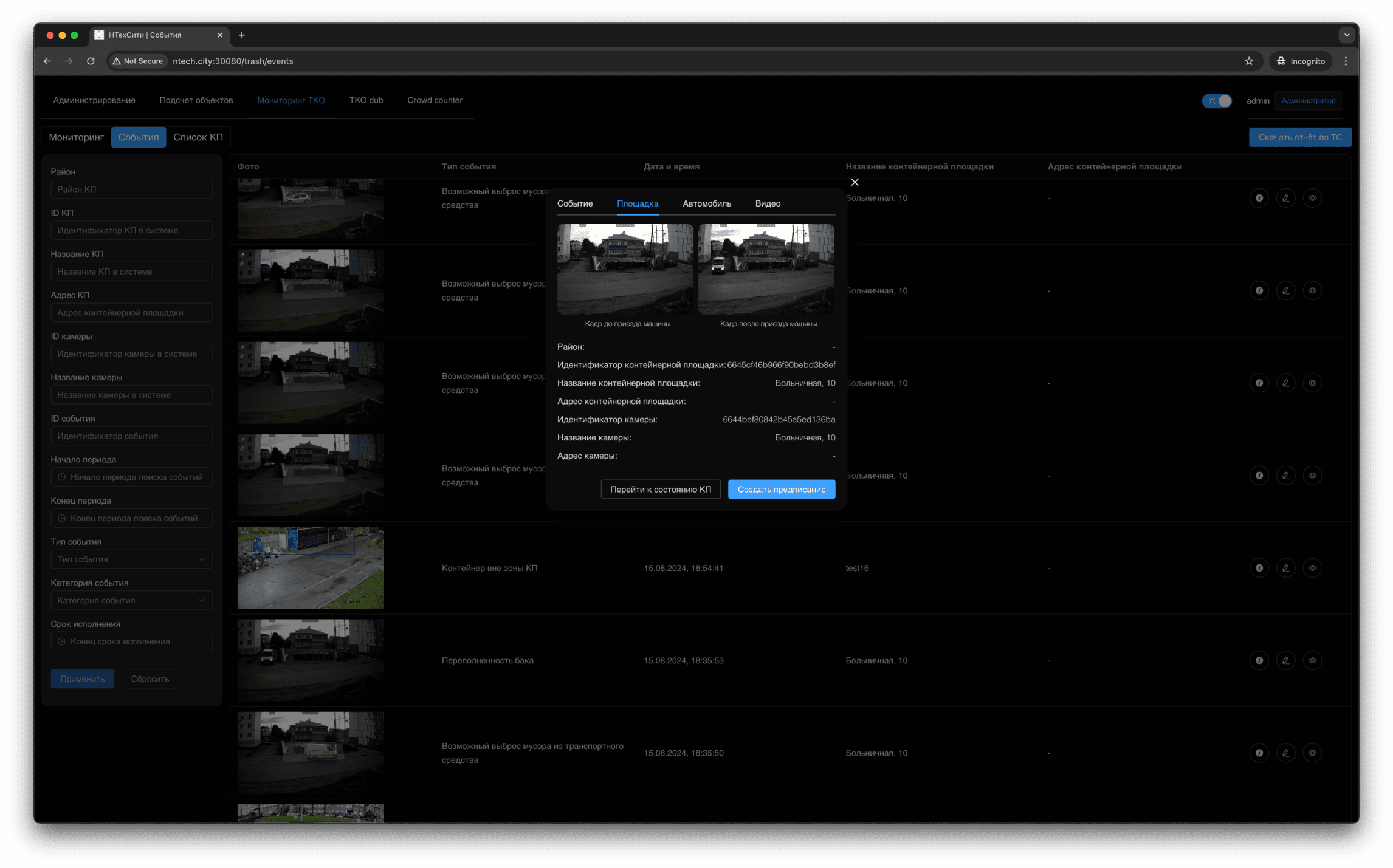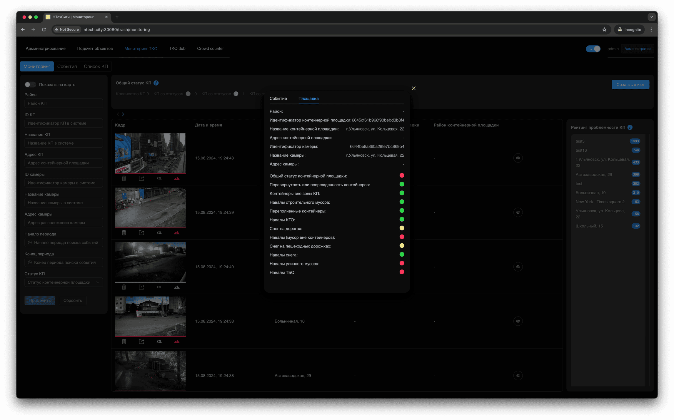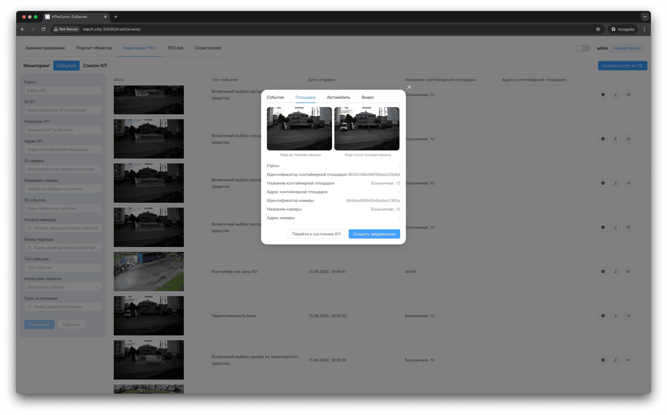 Для события мониторинга доступно детальное представление, в котором отображаются, в том числе, подстатусы контейнерной площадки, определенные на основании результатов работы нейронных сетей и эвристических алгоритмов.