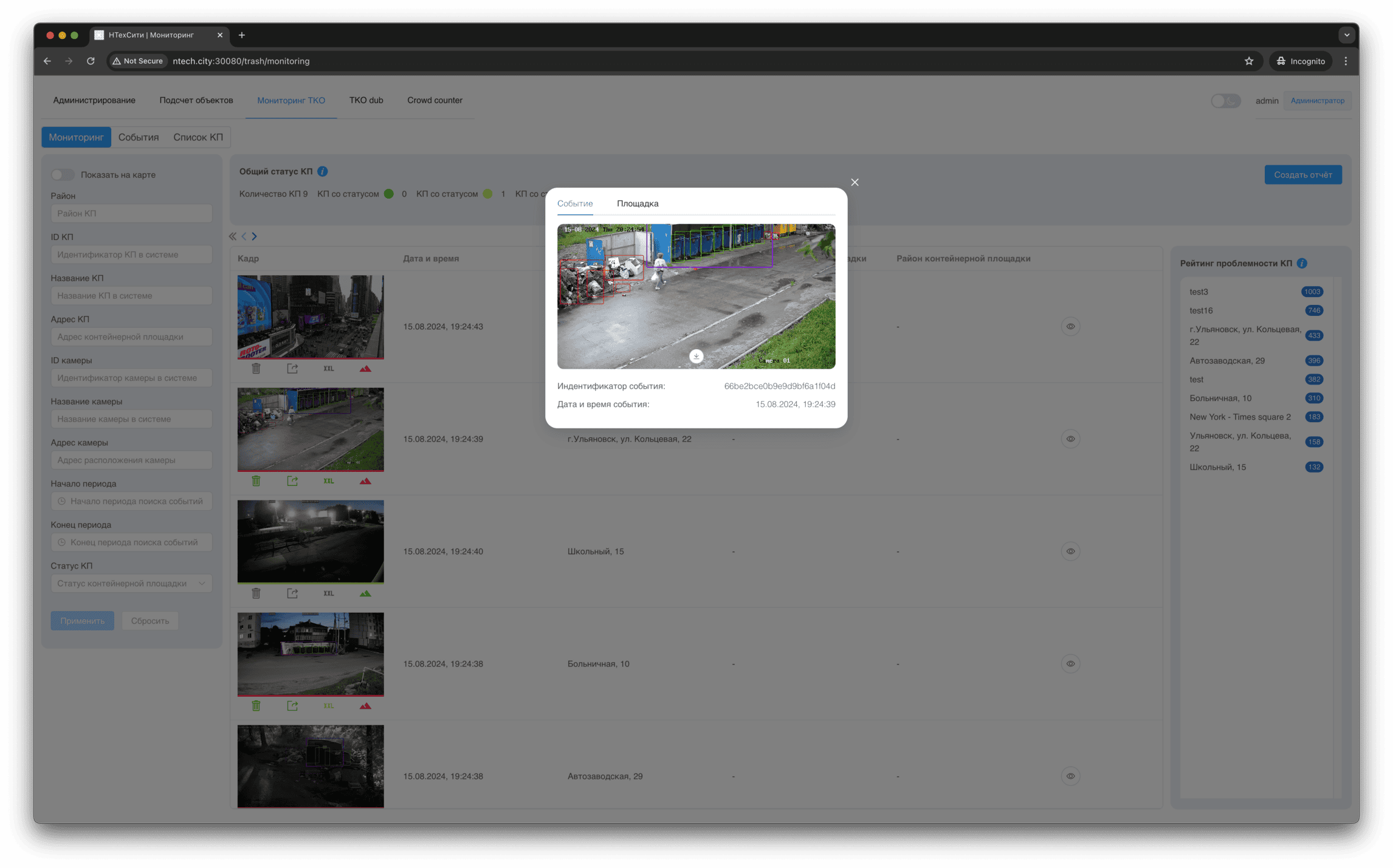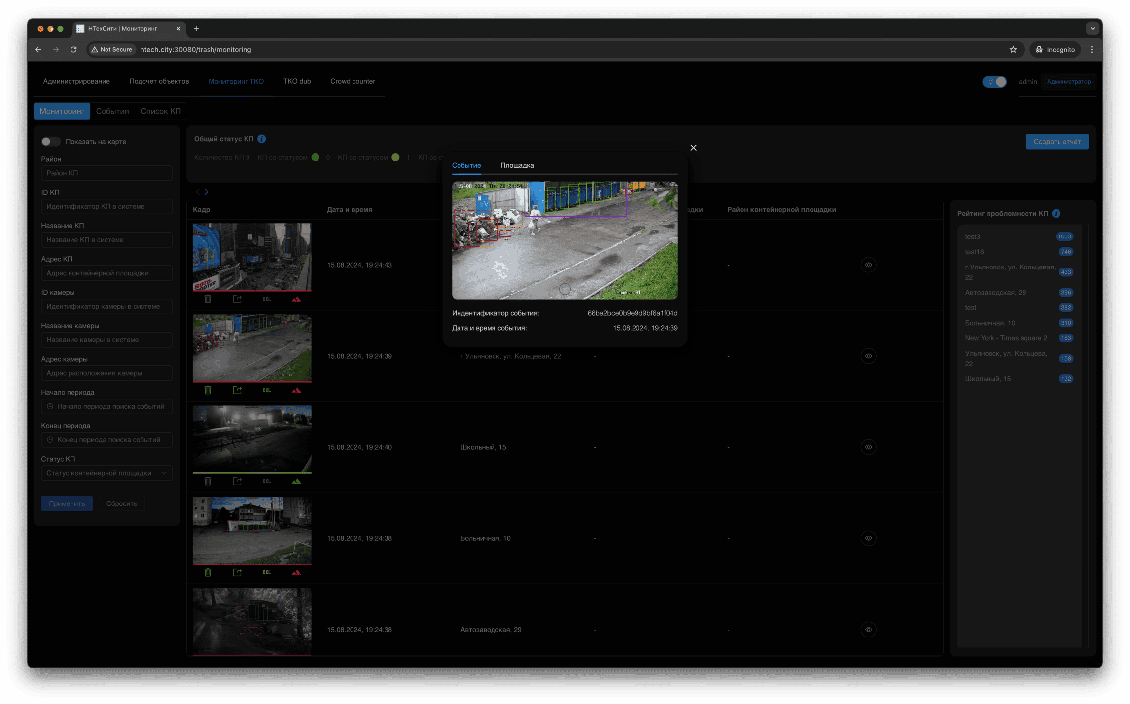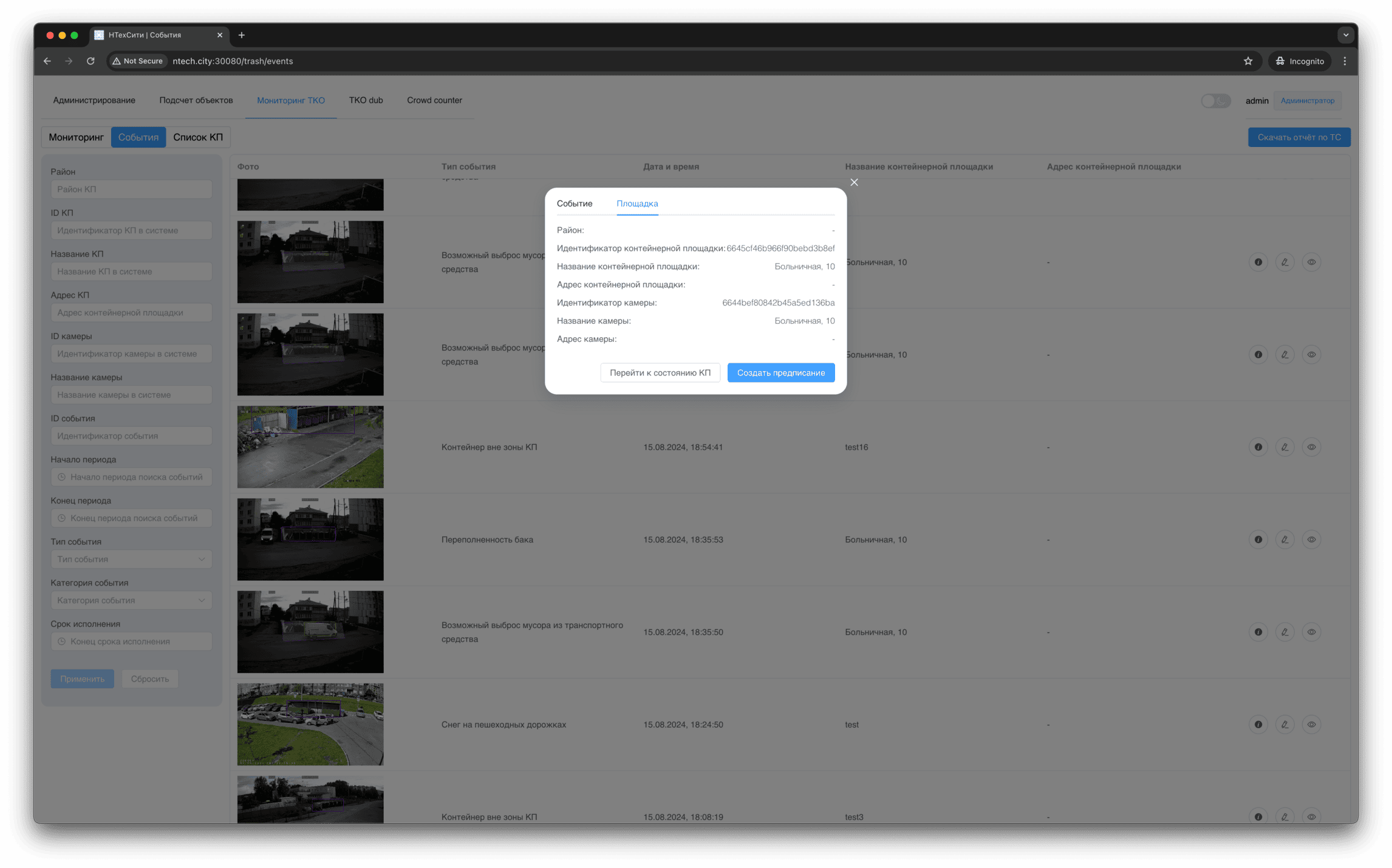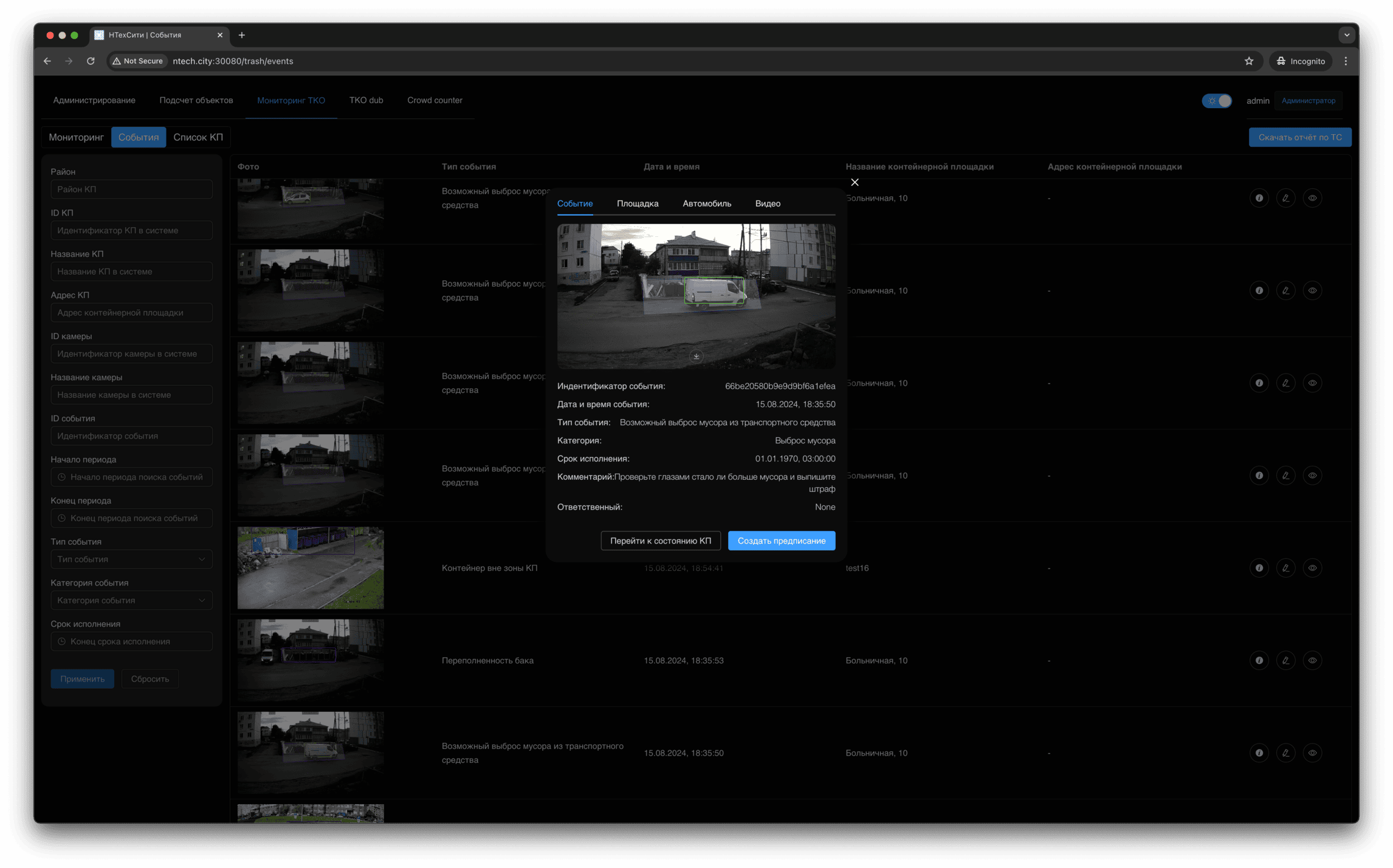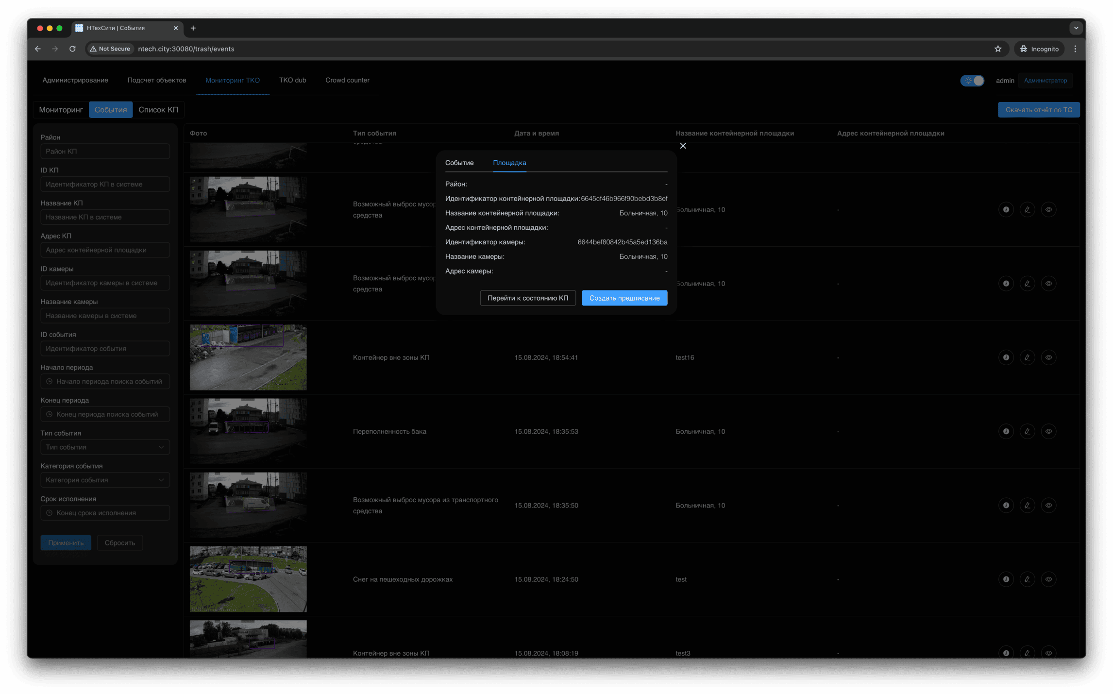 Для события мониторинга доступно детальное представление, в котором отображаются, в том числе, подстатусы контейнерной площадки, определенные на основании результатов работы нейронных сетей и эвристических алгоритмов.
