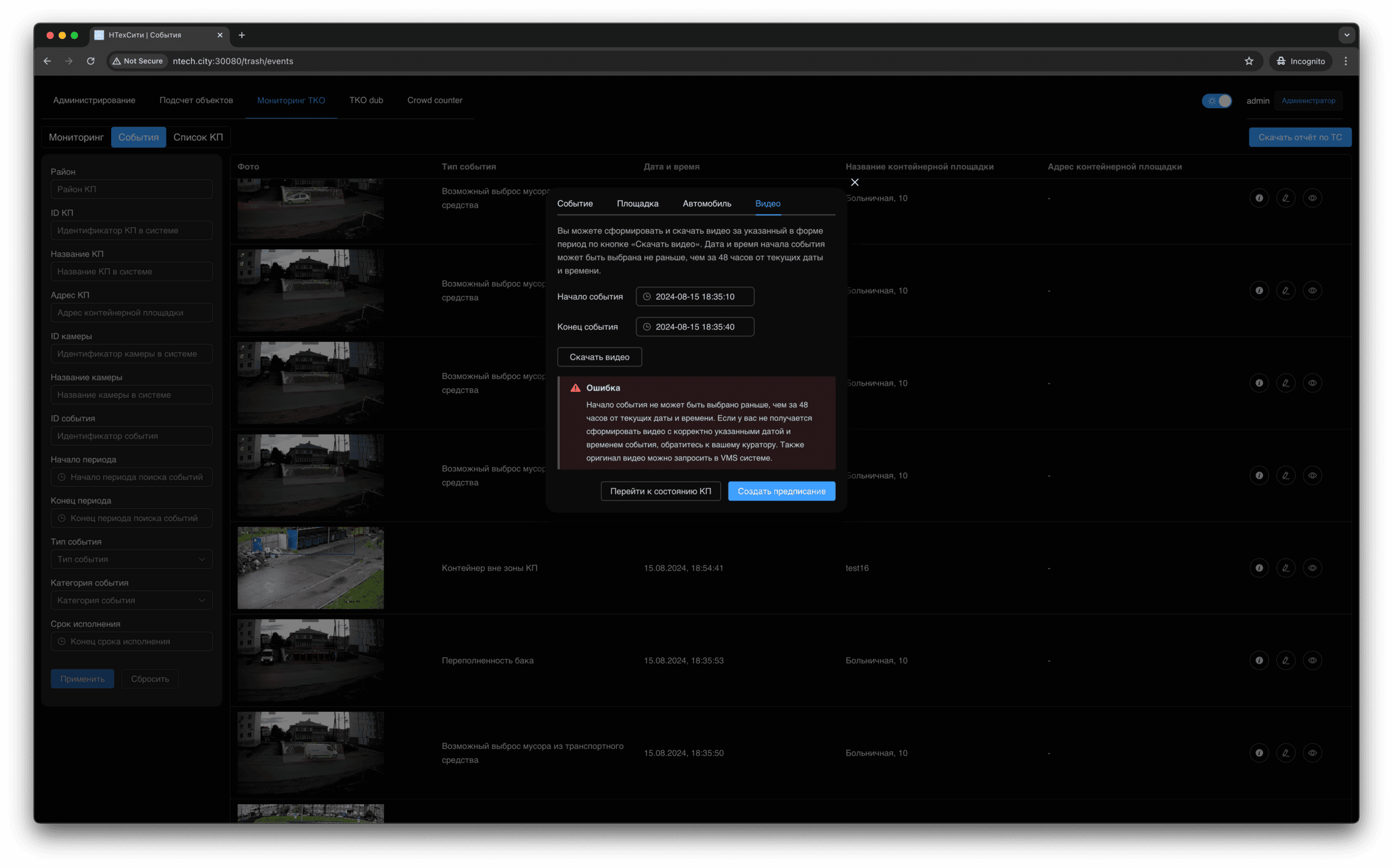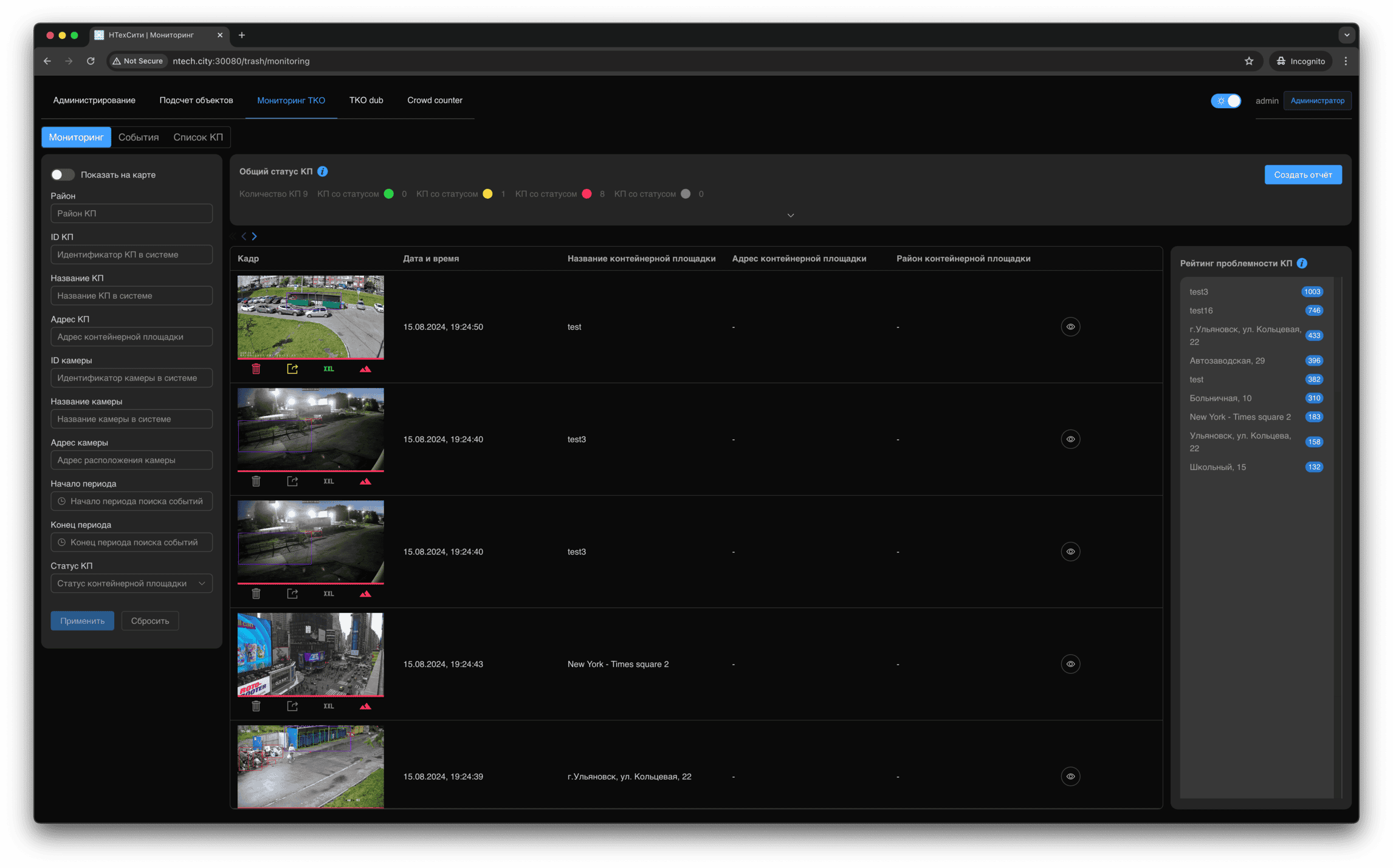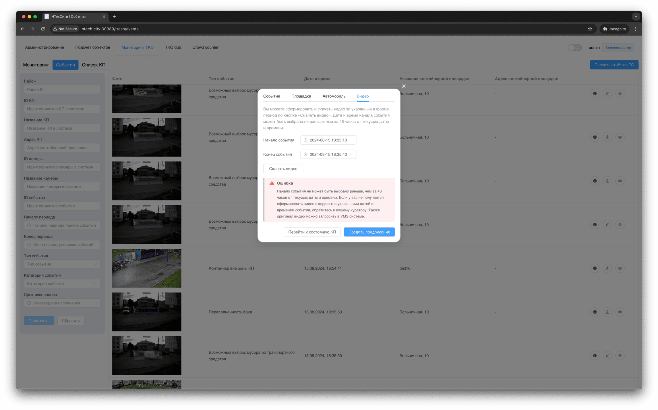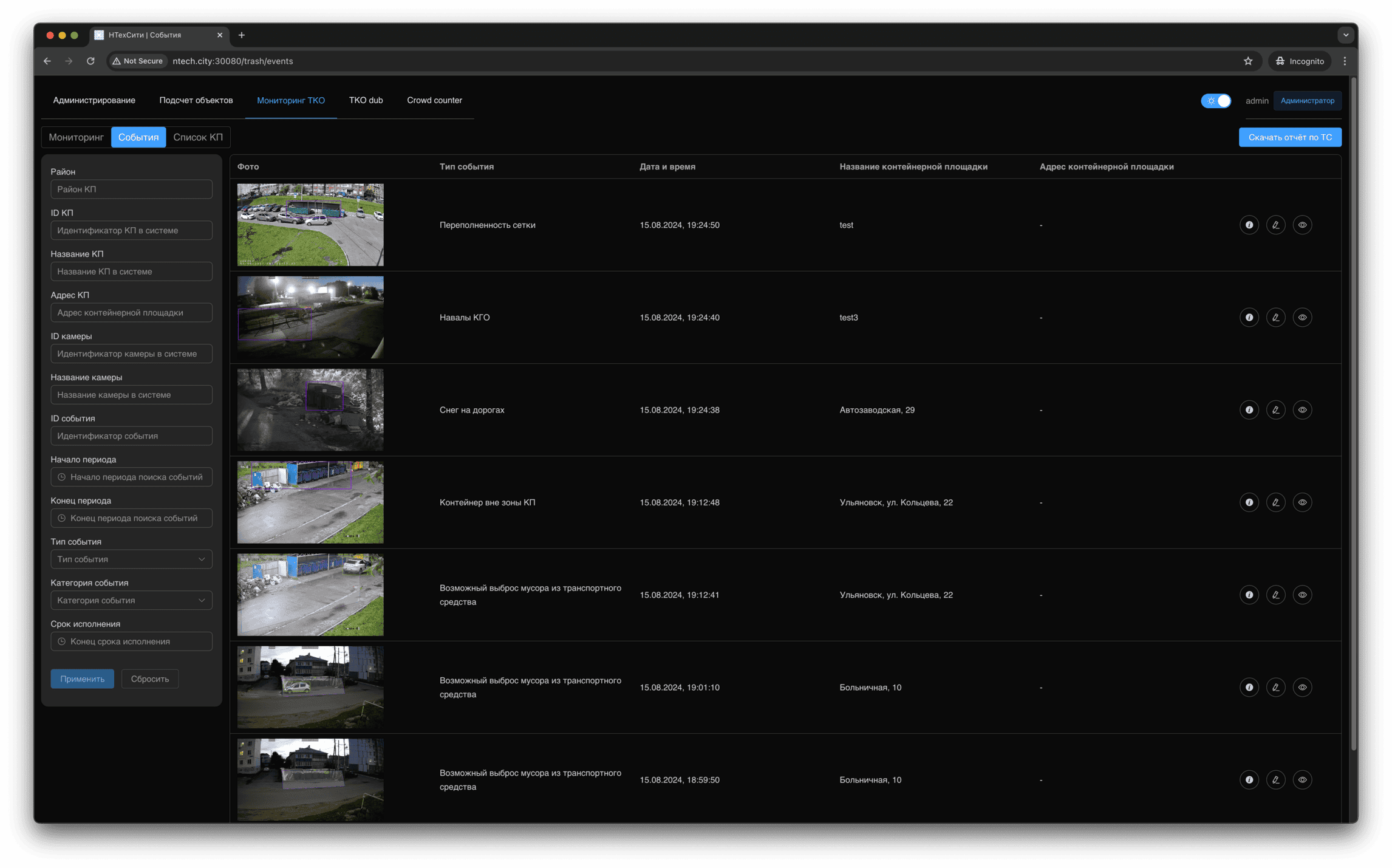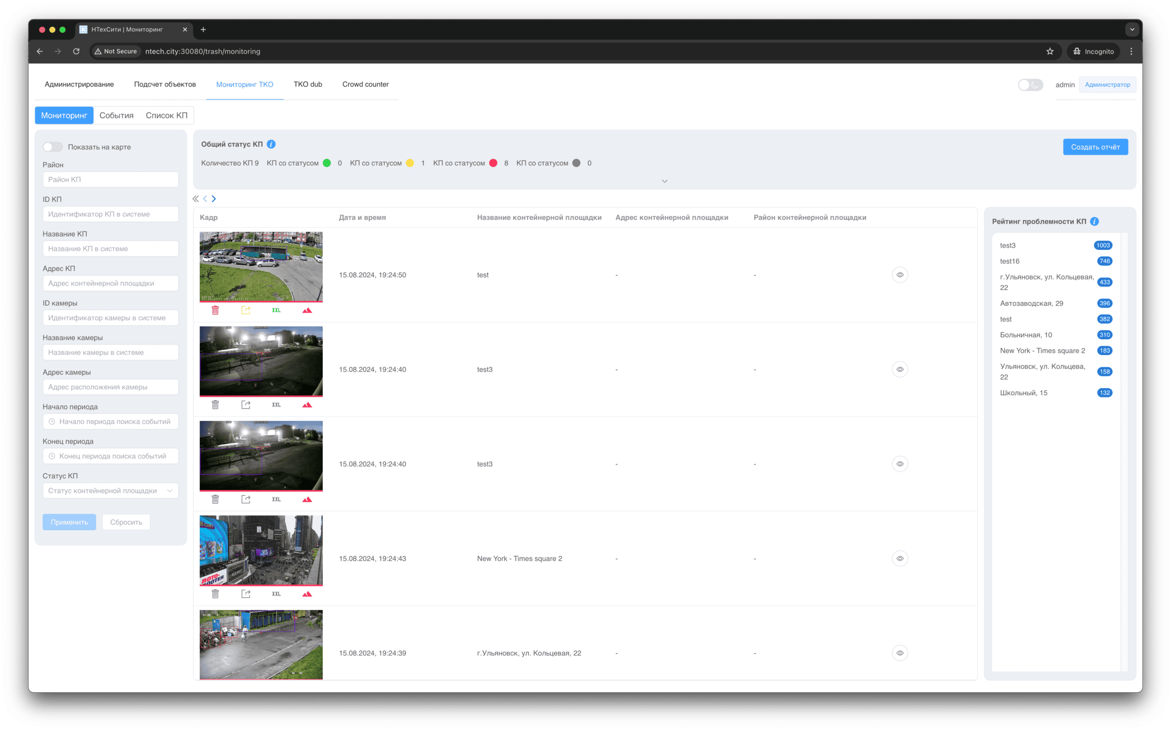 Для события мониторинга доступно детальное представление, в котором отображаются, в том числе, подстатусы контейнерной площадки, определенные на основании результатов работы нейронных сетей и эвристических алгоритмов.