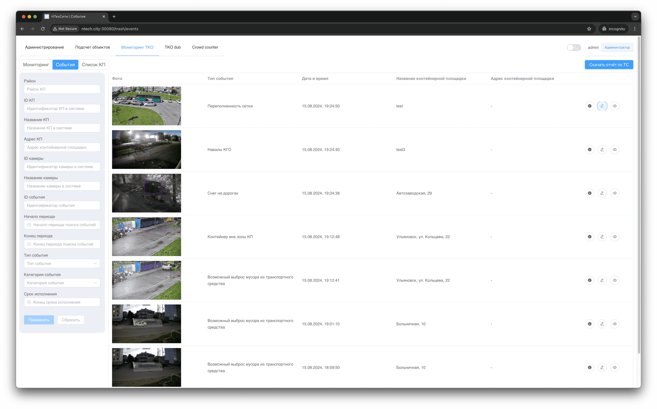 На вкладке Мониторинг представлен список событий мониторинга, отсортированный по убыванию даты и времени съемки.