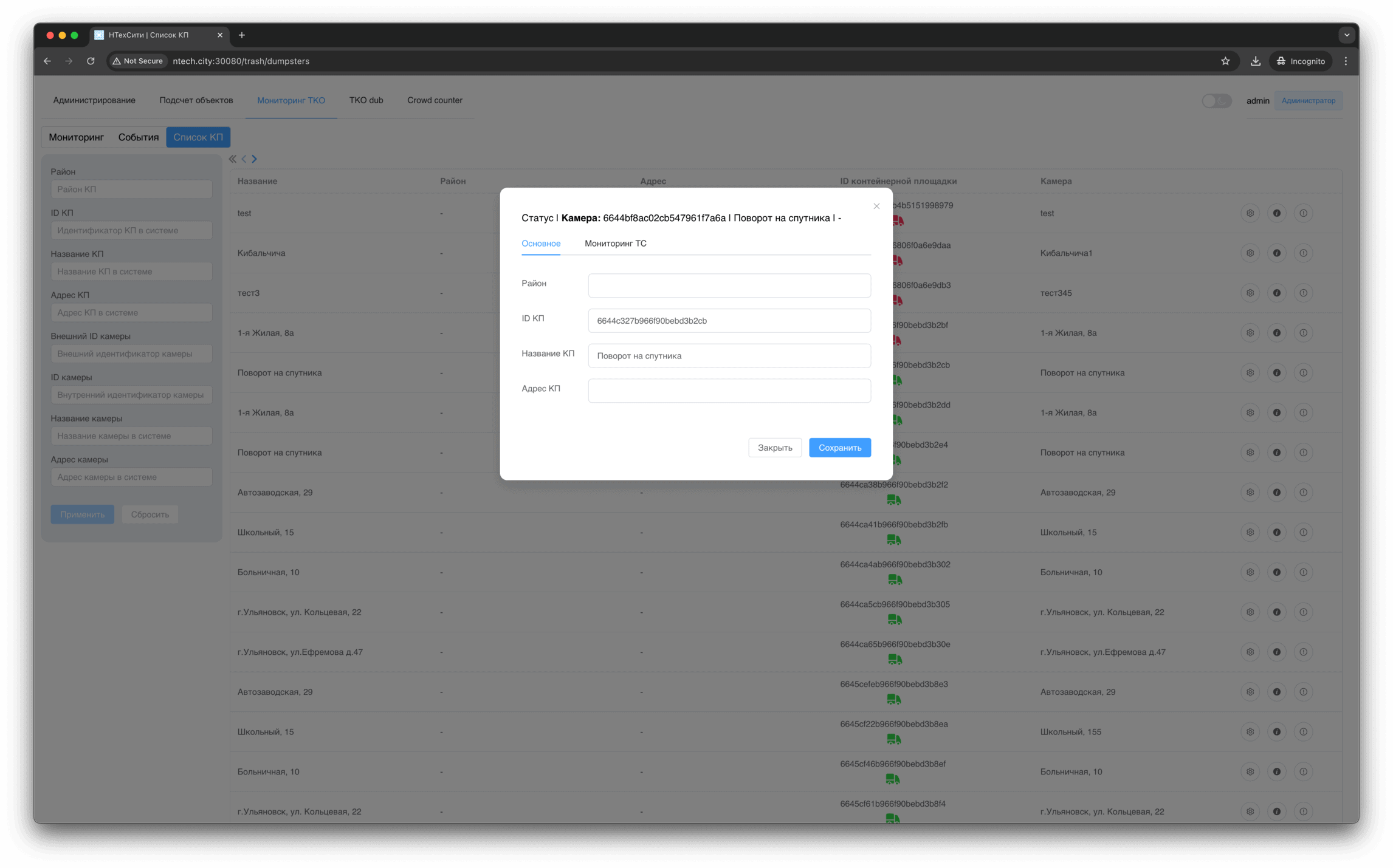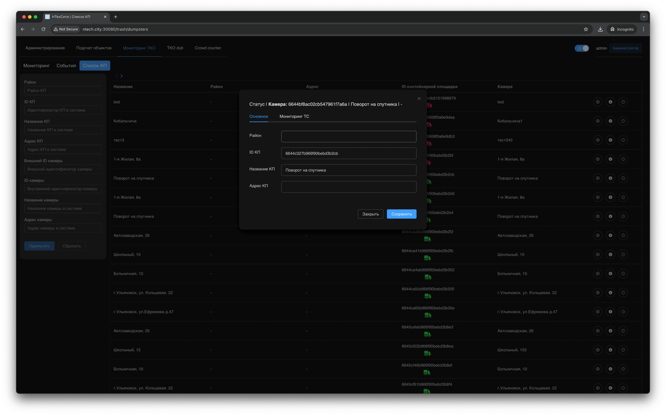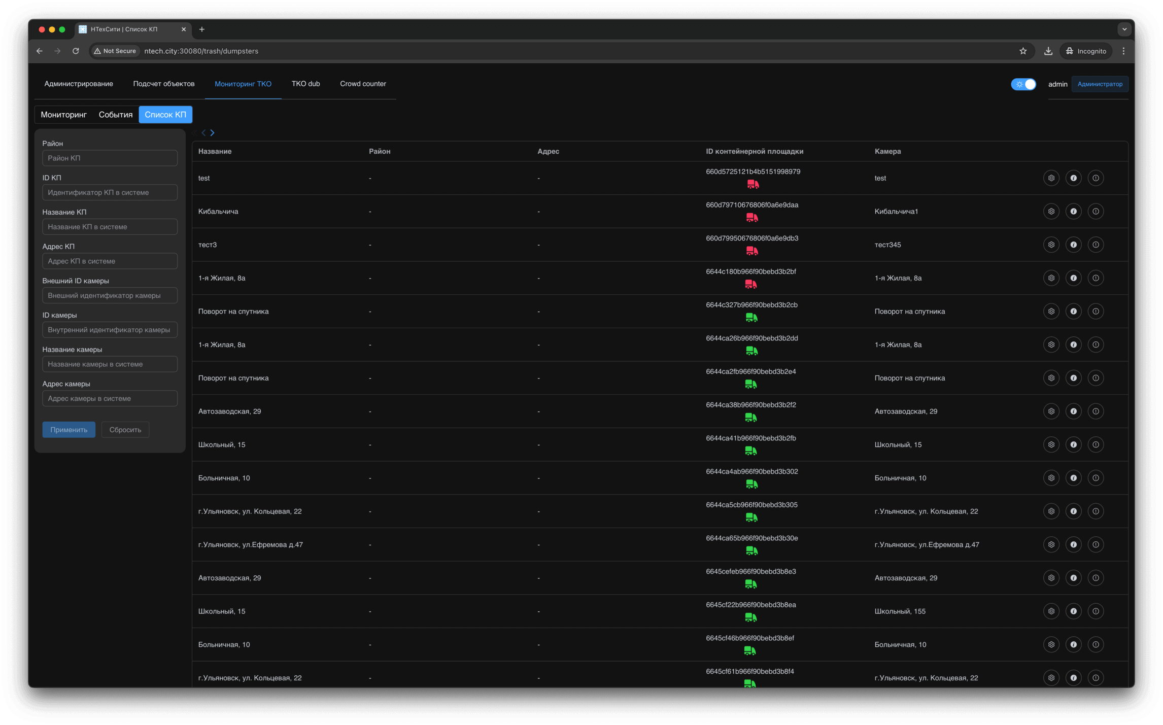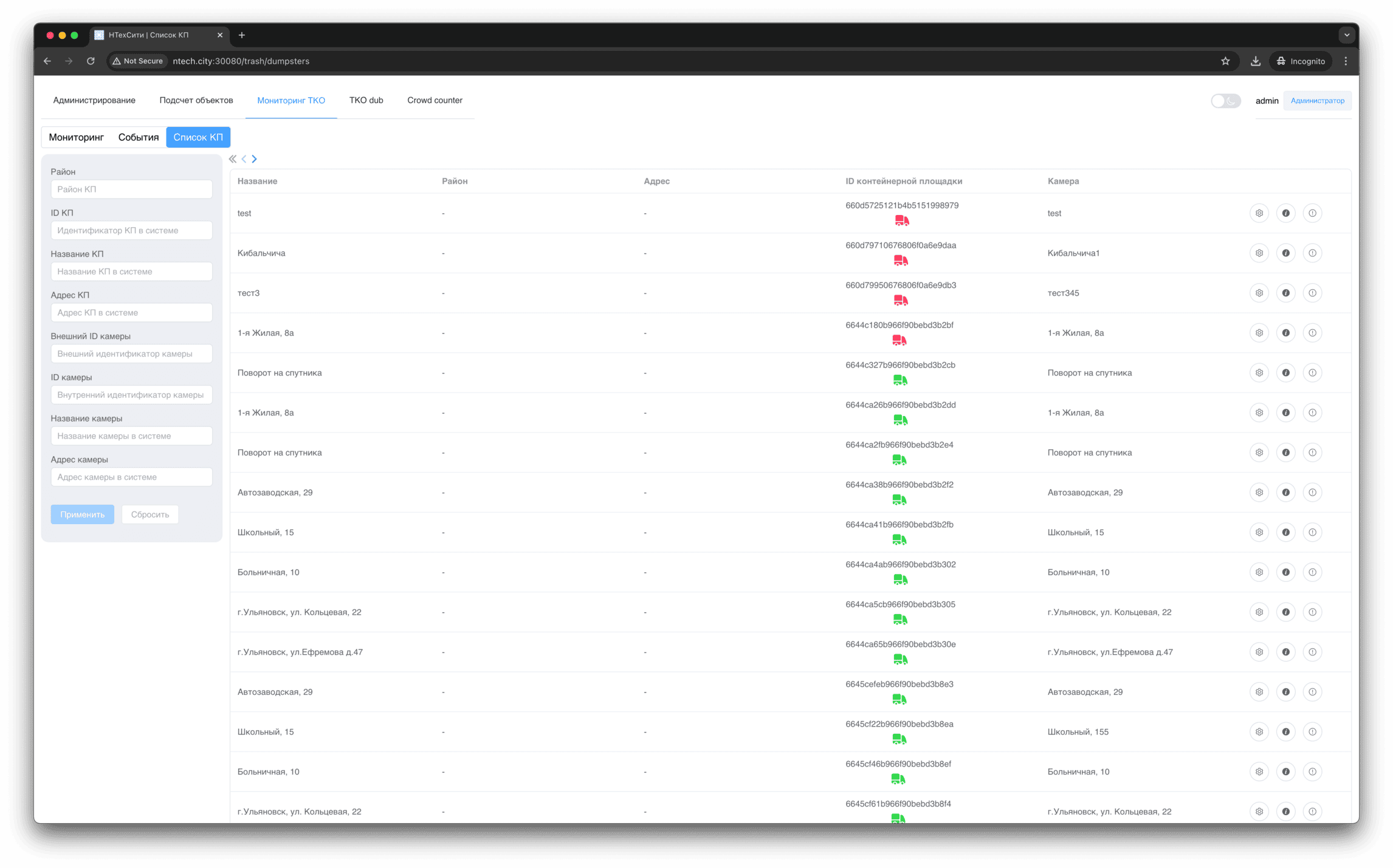 В разделе Список КП отображаются контейнерные площадки, доступные текущему пользователю.
