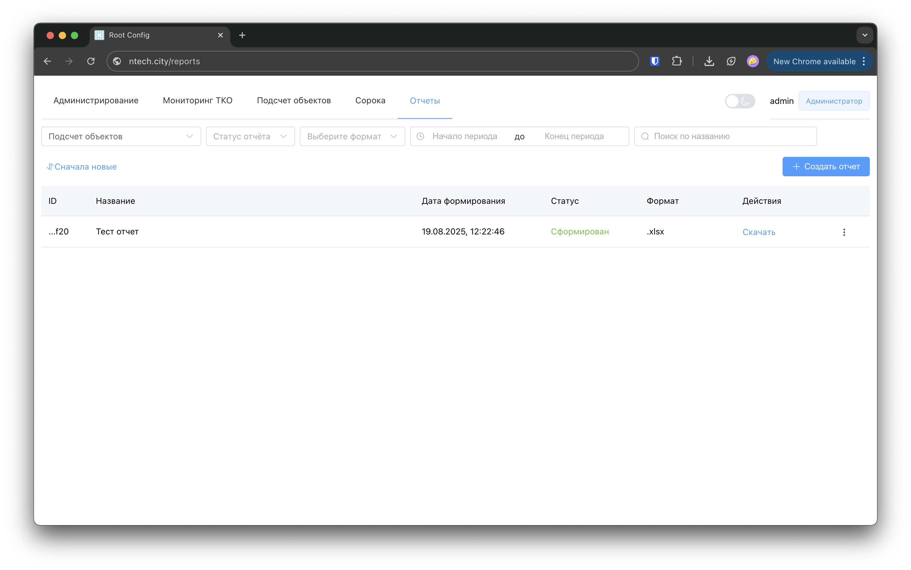 Формирование отчета займет некоторое время, зависящее от количества данных в системе и заданных фильтров. После изменения статуса отчета на "Сформирован" файл станет доступным для загрузки.