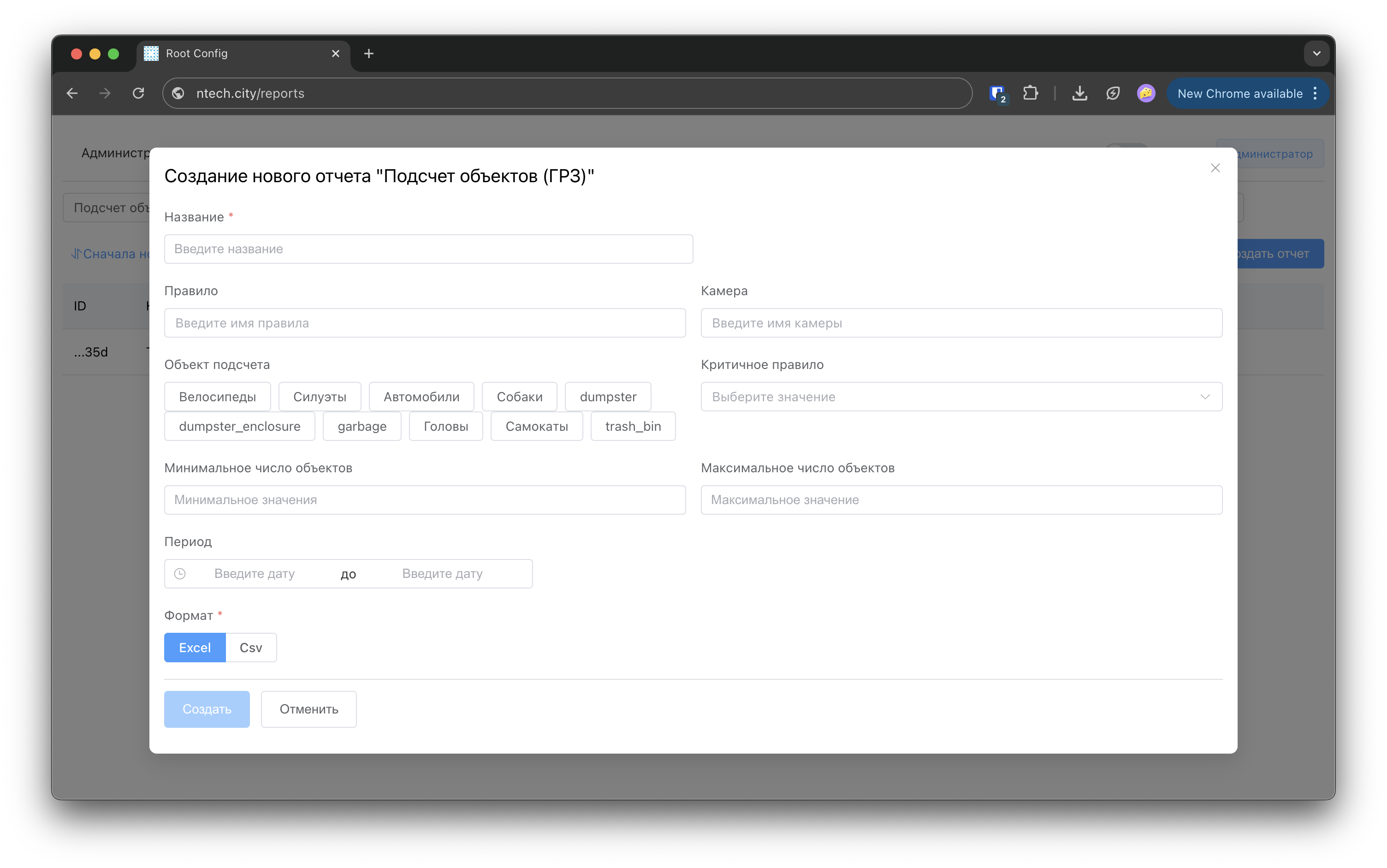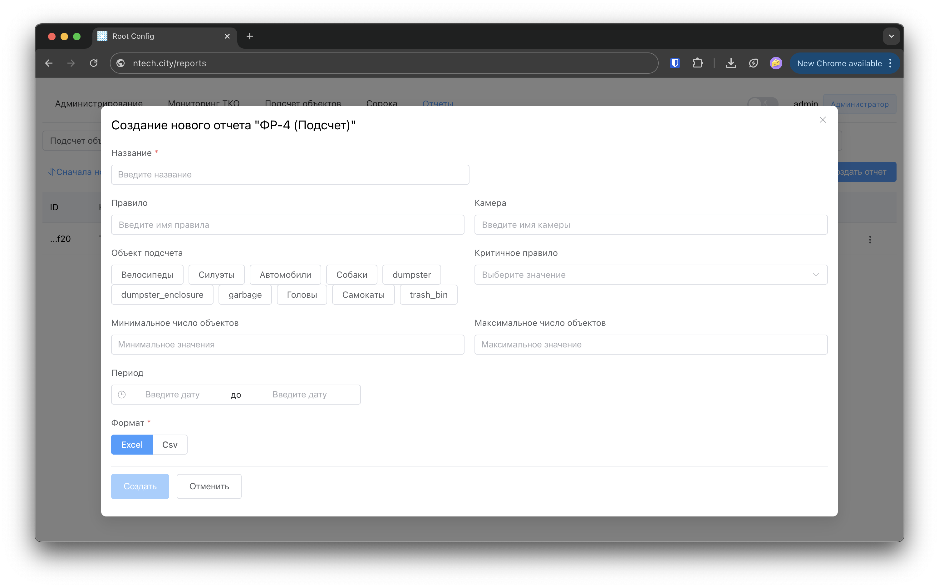 Для запроса отчета по результатам подсчета объектов необходимо нажать кнопку "Создать отчет". Перед созданием отчета убедитесь, что в выпадающем списке выбран необходимый вид отчета. После нажатия кнопки необходимо заполнить форму фильтрации данных. Обязательными для заполнения являются название отчета и формат выгрузки.