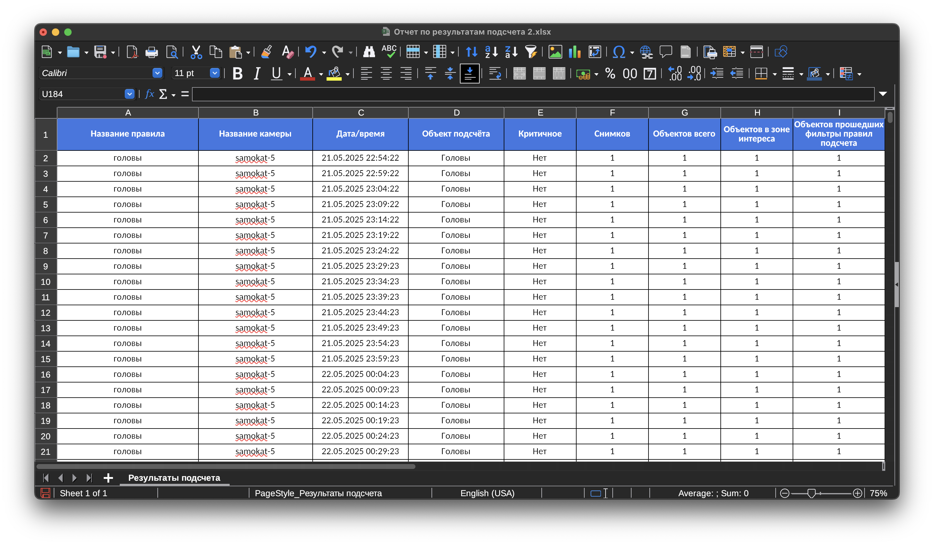 Отчет по результатам подсчета объектов состоит из одной вкладки. Дополнительная фильтрация данных может быть осуществлена по любому столбцу встроенными средствами системы работы с электронными таблицами.